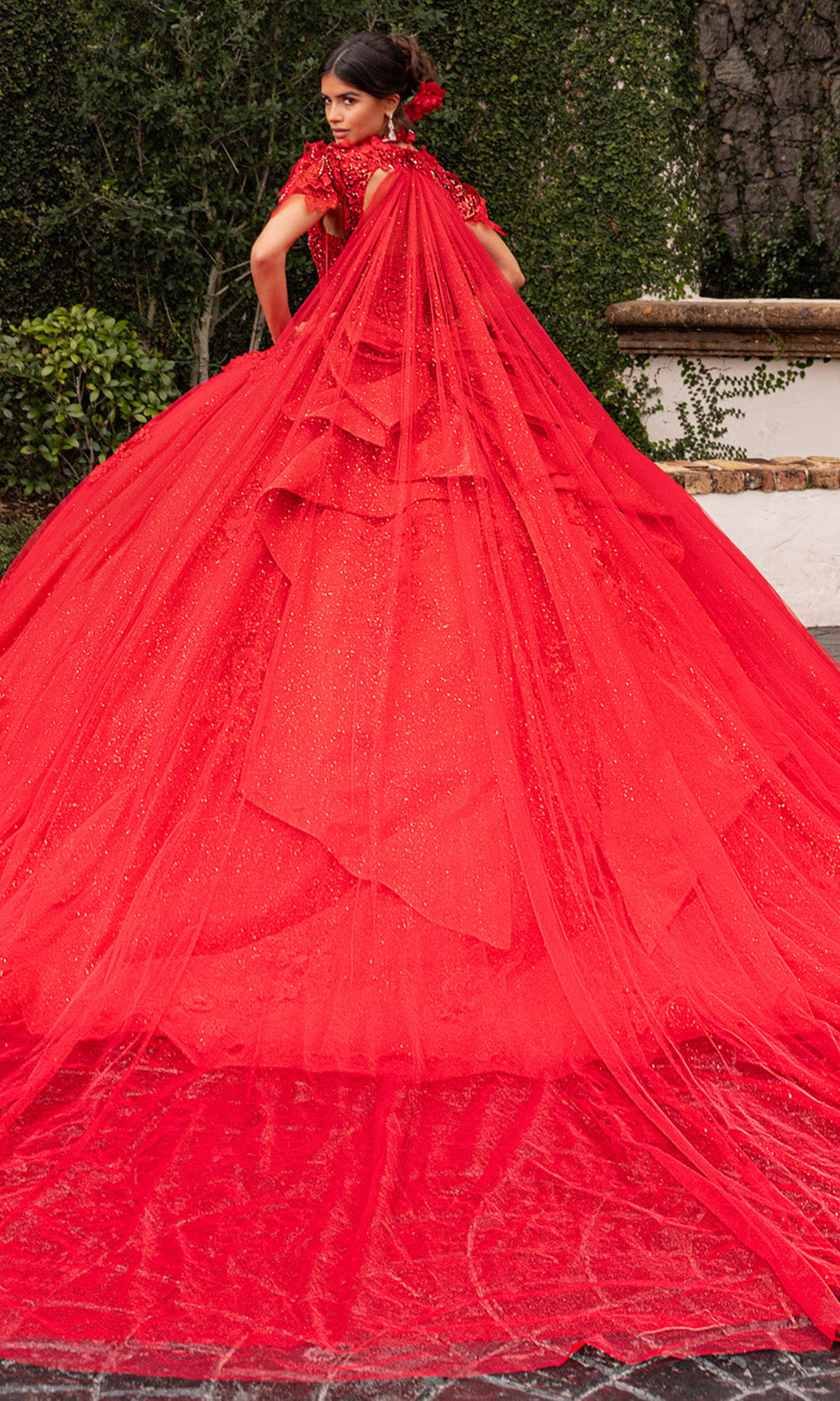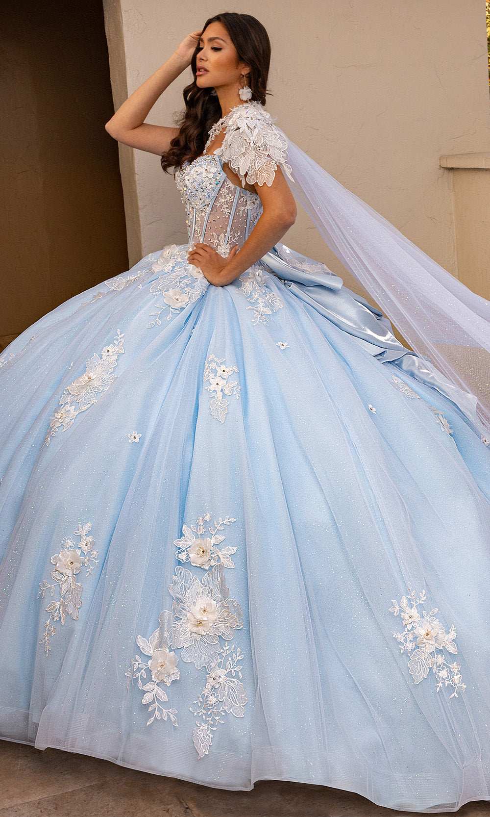 For a look that is both enchanting and bold, this Rachel Allan RQ3156 strapless quinceanera gown offers a masterful fusion of structured elegance and floral whimsy. The illusion corset bodice is intricately detailed with 3D florals, embroidery and beading that enhances the Basque waist, drawing the eye to its artful craftsmanship. Cascading into a full ballgown skirt layered with glittering tulle, it delivers a luminous and voluminous finish. Designed to celebrate life grandest milestones, the Rachel Allan RQ3156 exudes refined beauty and unforgettable presence for any once in a lifetime event. Models are wearing Powder Blue White, and Red colors.