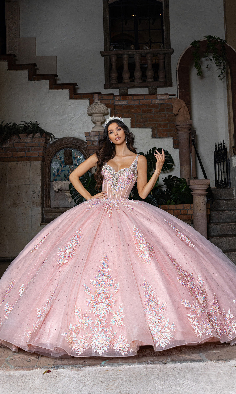 Step into a tiered fantasy with this Rachel Allan RQ3158 breathtaking gown that blends modern volume with timeless beauty. Featuring wide straps and a sheer corset-style bodice, this design flatters the waistline and frames the sweetheart neckline with effortless poise. The layered ballgown skirt flows gracefully with each step, shimmering with embedded glitter, beaded and floral embroidery for added charm. A detachable corset overlay and bow provide flexibility to shift from structured glam to soft sophistication. Rachel Allan RQ3158 is the quintessential piece for those who seek dramatic flair with a contemporary edge on their special celebration. Models are wearing Blush, and Sky Blue colors.