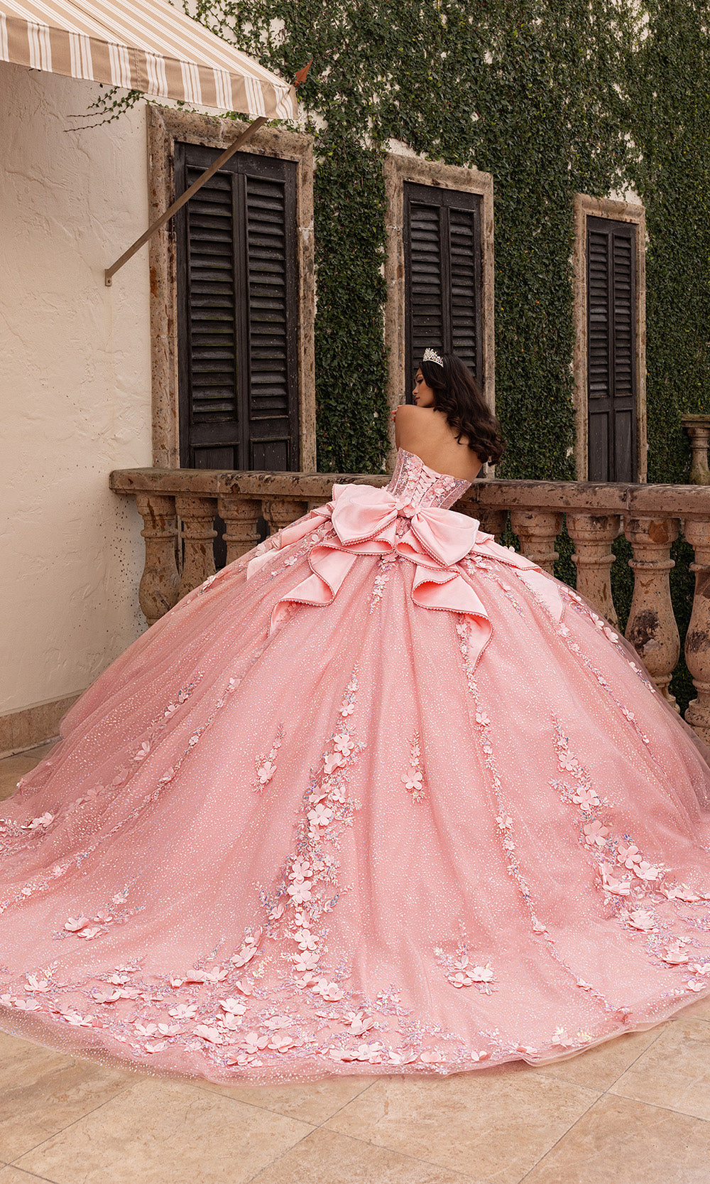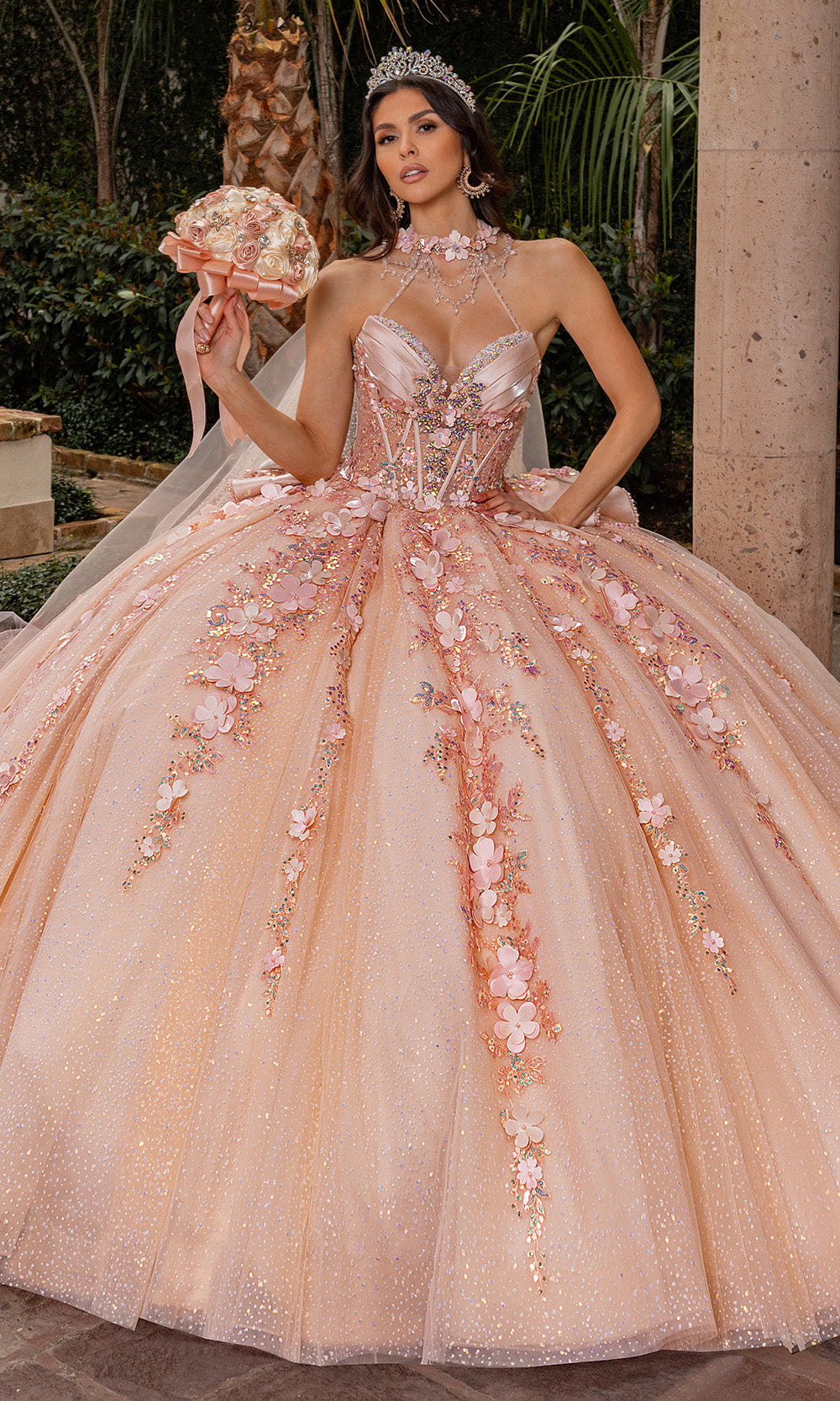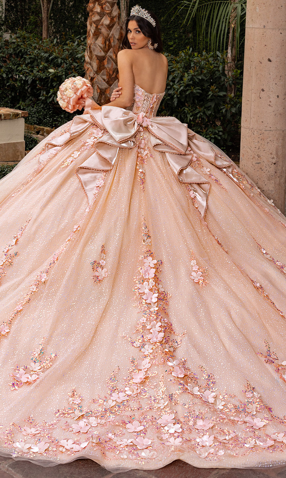 Let your fairy tale unfold with grace in this Rachel Allan RQ3162 ballgown that turns imagination into reality. This strapless style features a sweetheart neckline that elegantly transitions into a structured bodice adorned with 3D floral appliques, embroidery and beading. The voluminous ballgown skirt sparkles with embedded glitter, offering movement and brilliance from every angle. Completed with detachable bow and train, this design is tailored for a moment that demands lasting memories. Ideal for celebrating milestones in style, the Rachel Allan RQ3162 delivers grandeur, texture, and artistry in one unforgettable silhouette. Models are wearing Blush, and Champagne colors.