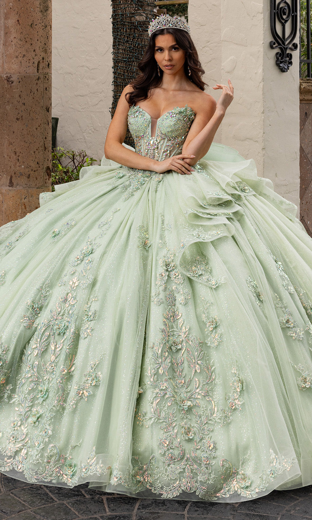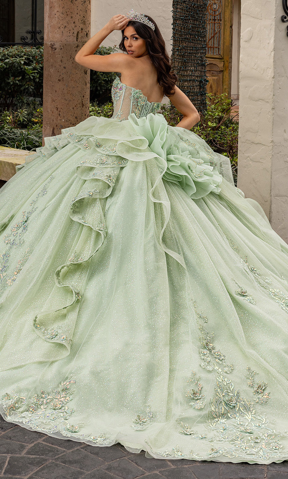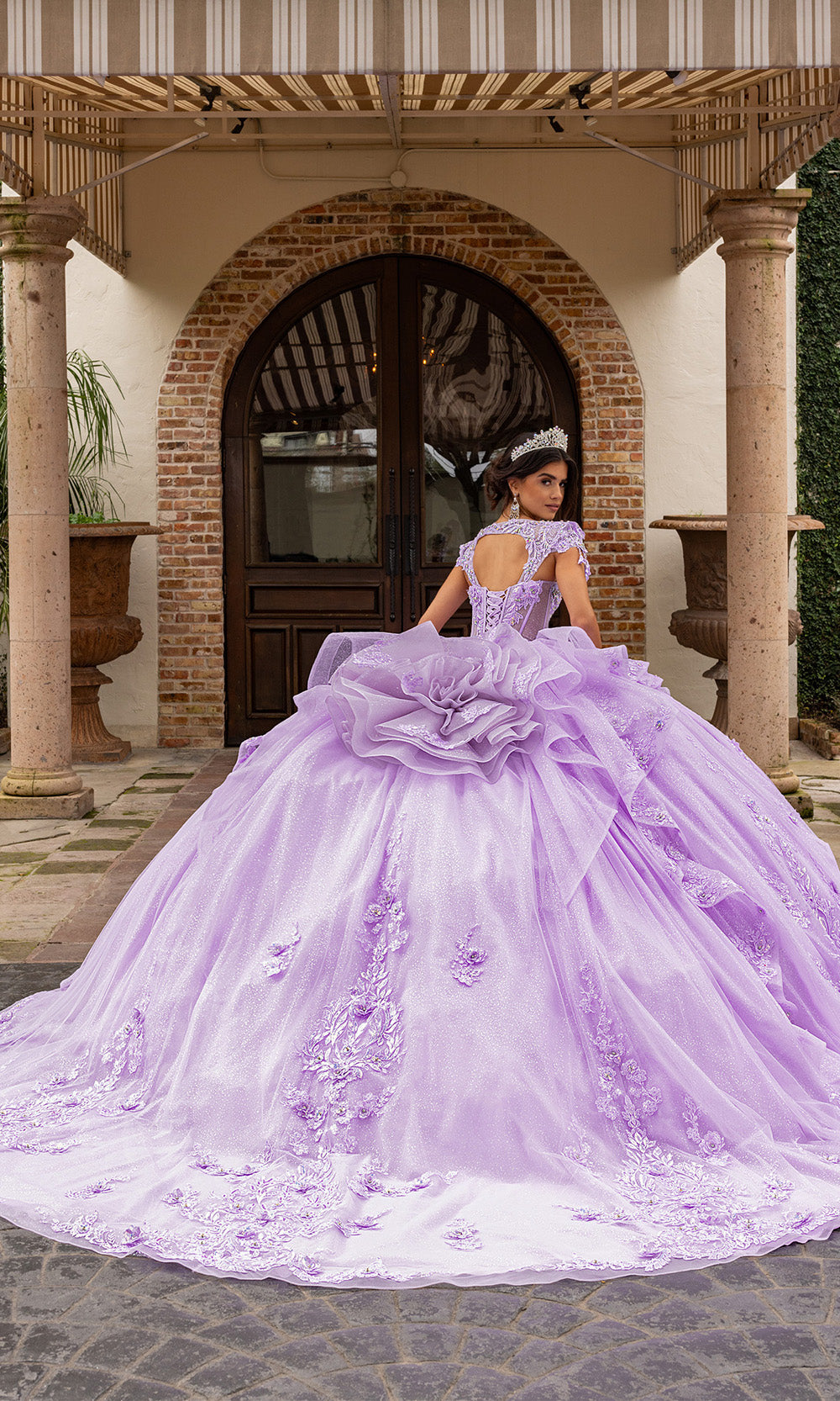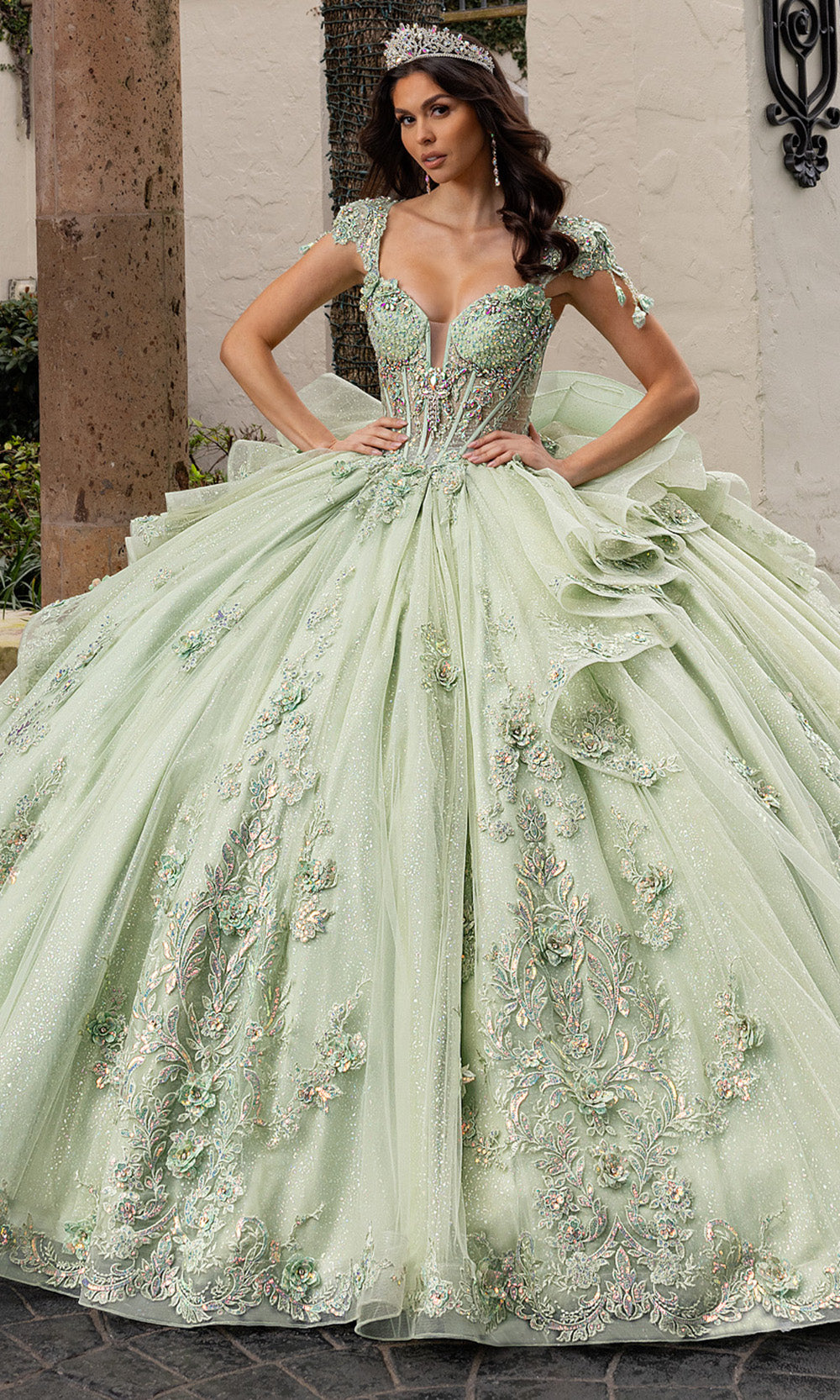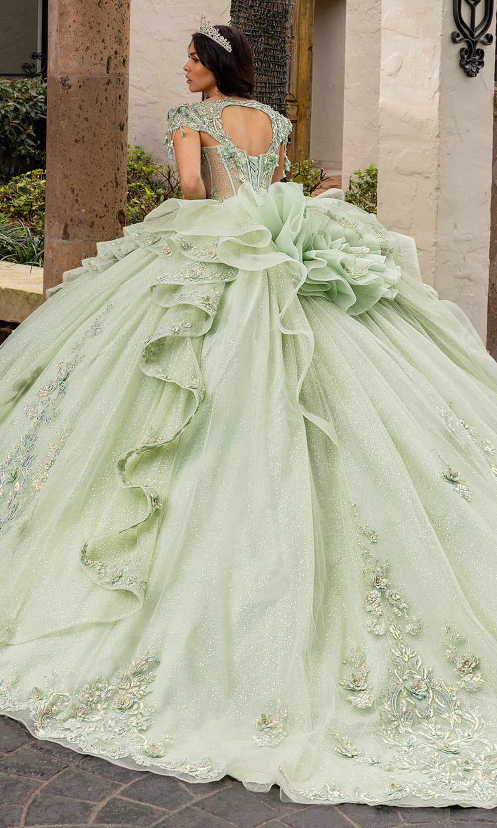 Grace meets glamour in this breathtaking Rachel Allan RQ3163 quinceanera gown that evokes the charm of a blooming garden. A structured sweetheart neckline and corset bodice sculpt the figure with precision and artistry. Layers of tulle cascade into a voluminous ballgown skirt embellished with 3D floral embroidery and shimmer beaded accents. Ruffle accents at the waist add dimension and sophistication, while the detachable floral bow and detachable cap sleeves creates a captivating visual story. Whether you are celebrating a milestone or attending an unforgettable event, Rachel Allan RQ3163 ensures a lasting impression with its blend of sophistication, dreamy detailing, and impeccable craftsmanship. Models are wearing Lilac Iridescent, and Sage Iridescent colors.