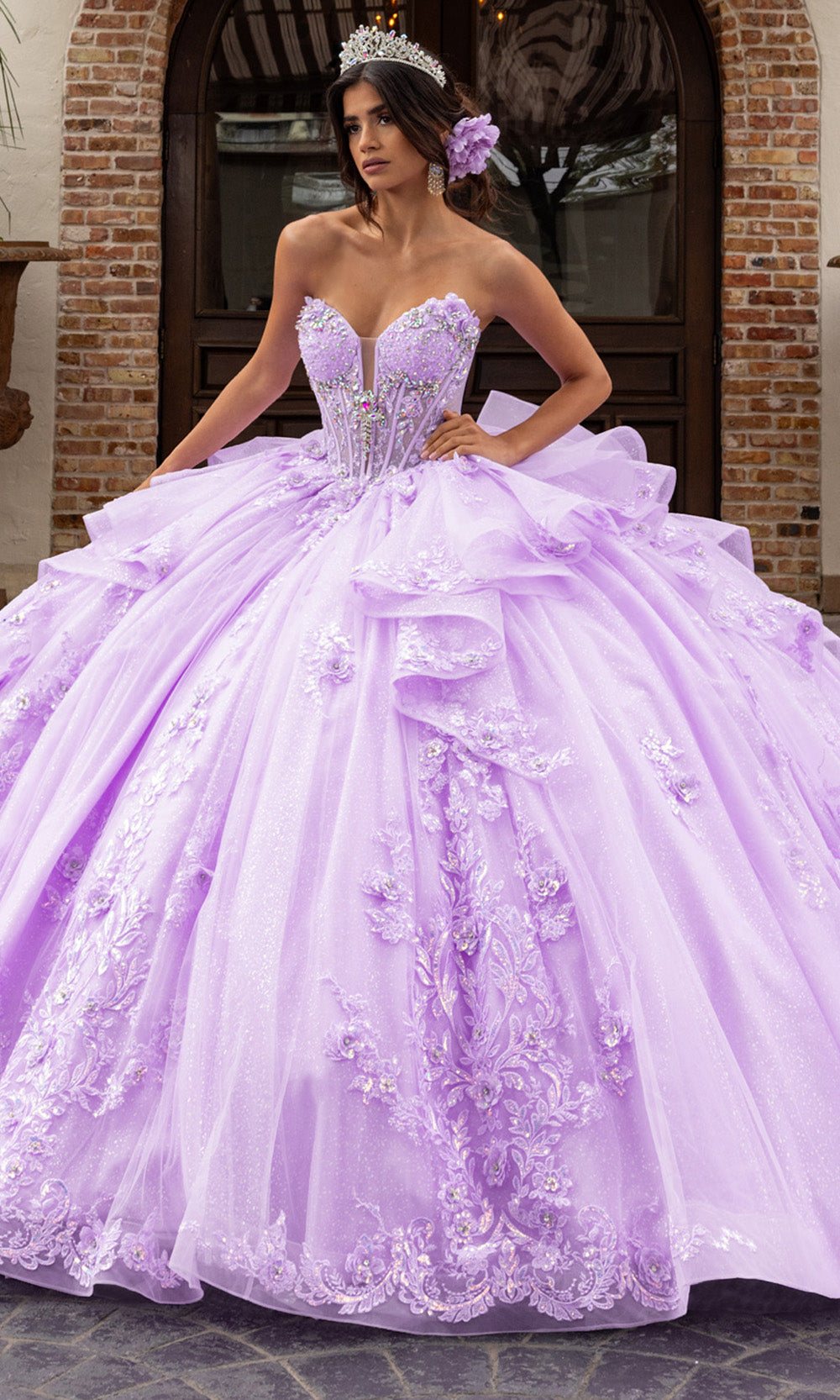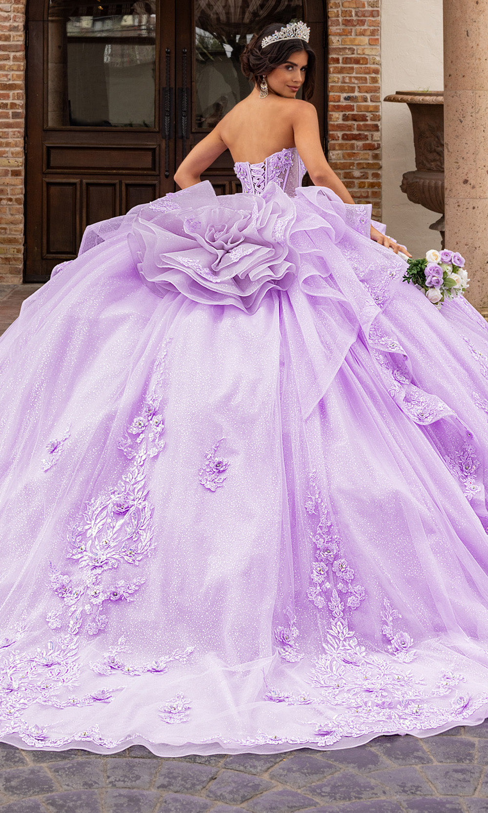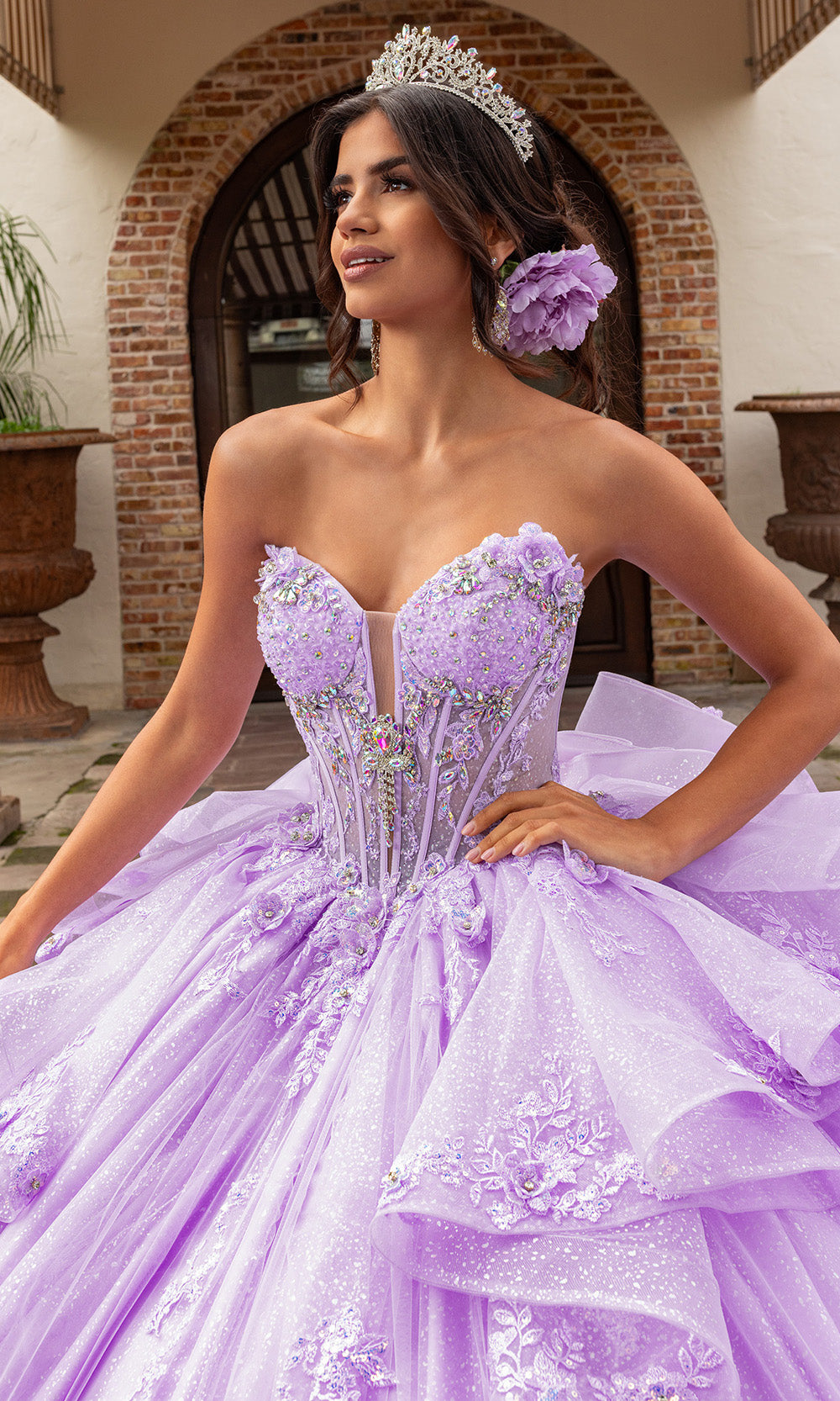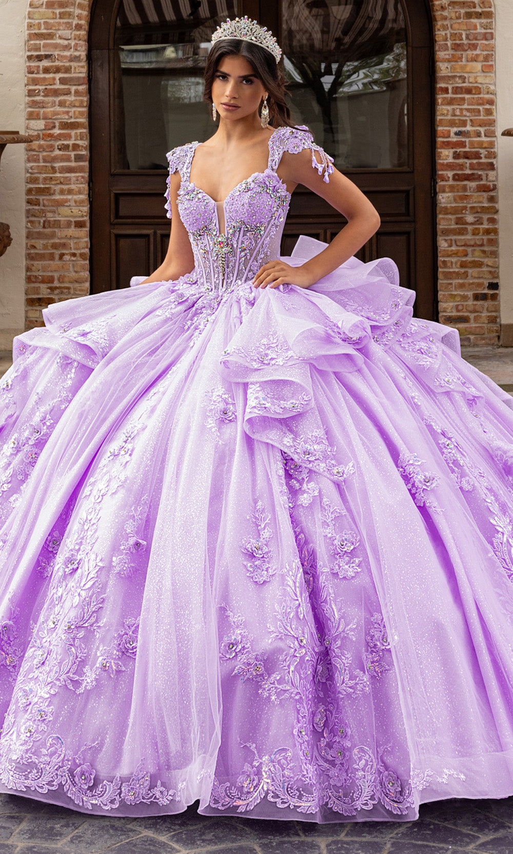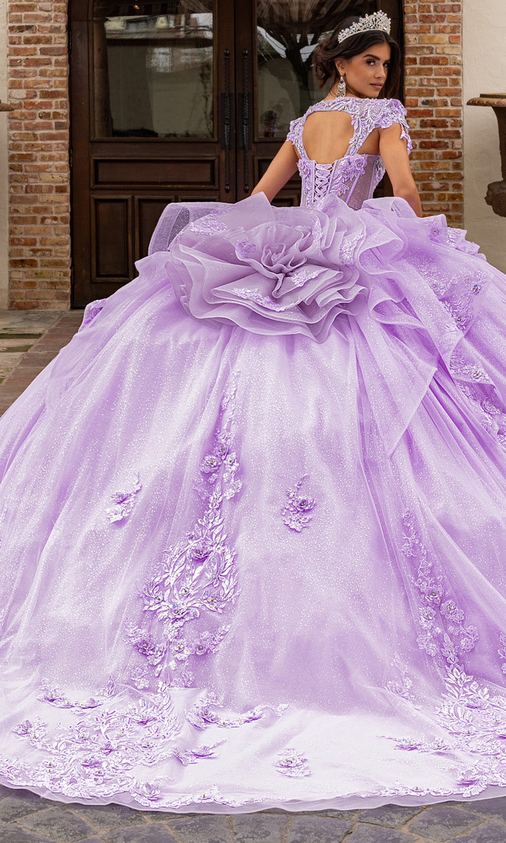 Grace meets glamour in this breathtaking Rachel Allan RQ3163 quinceanera gown that evokes the charm of a blooming garden. A structured sweetheart neckline and corset bodice sculpt the figure with precision and artistry. Layers of tulle cascade into a voluminous ballgown skirt embellished with 3D floral embroidery and shimmer beaded accents. Ruffle accents at the waist add dimension and sophistication, while the detachable floral bow and detachable cap sleeves creates a captivating visual story. Whether you are celebrating a milestone or attending an unforgettable event, Rachel Allan RQ3163 ensures a lasting impression with its blend of sophistication, dreamy detailing, and impeccable craftsmanship. Models are wearing Lilac Iridescent, and Sage Iridescent colors.