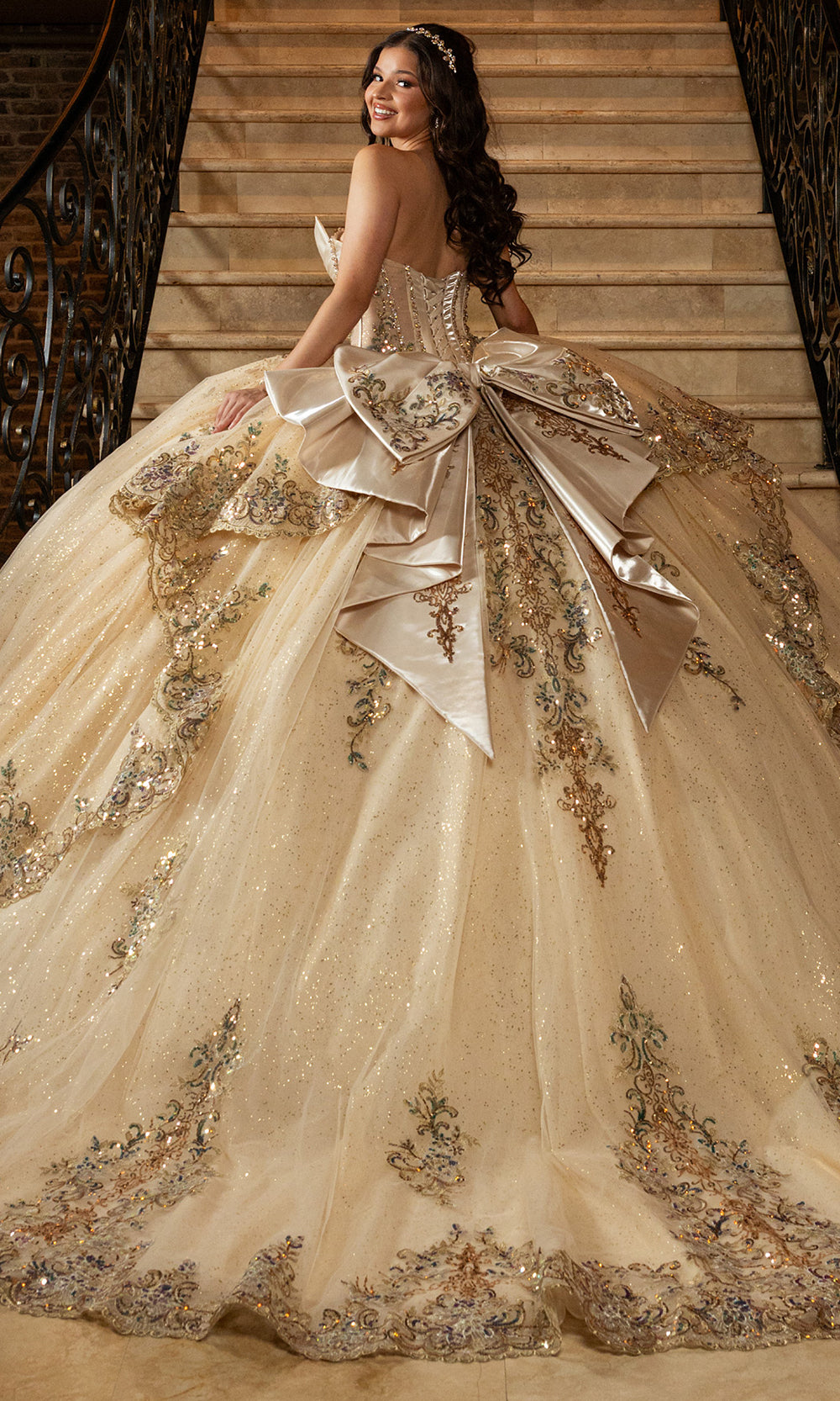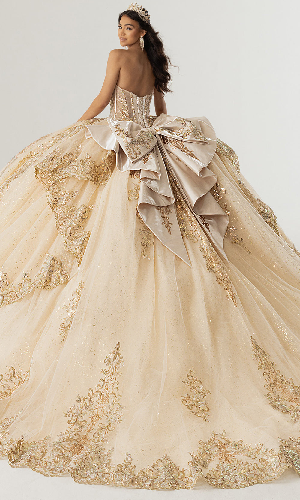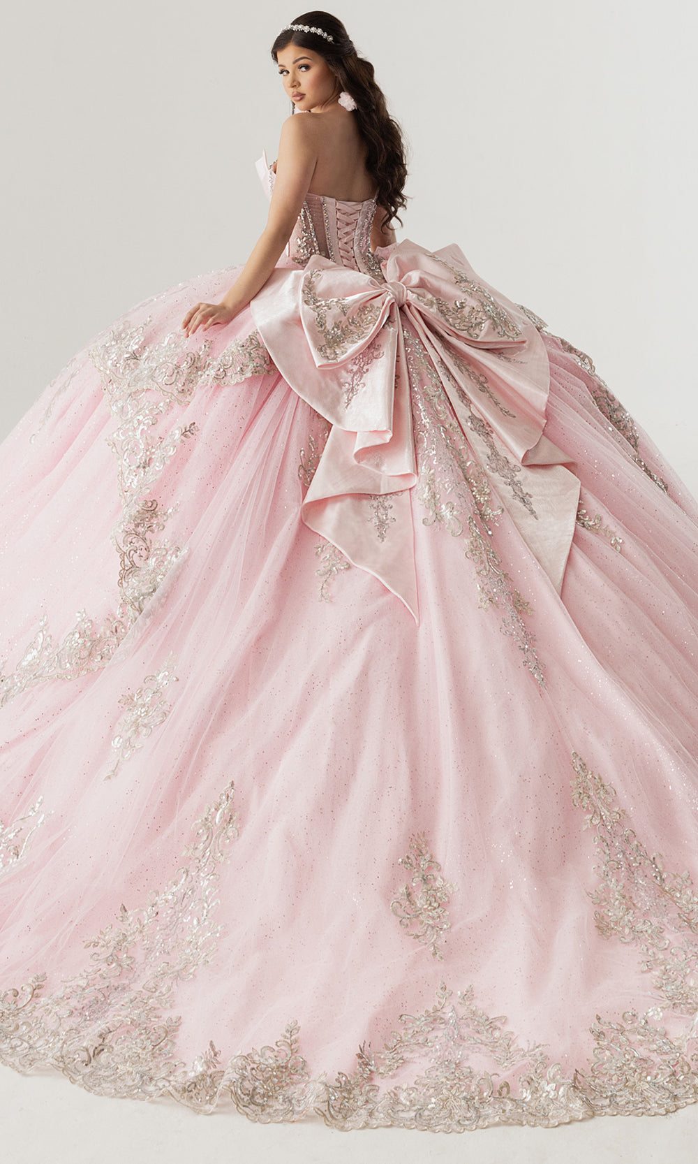 Celebrating couture craftsmanship, Rachel Allan style RQ3172 is a breathtaking quinceanera gown designed to command attention from every angle. The structured corset bodice is enhanced with shimmering sequin and applique embroidery that defines the waist while providing elegant support. A sheer illusion neckline is adorned with draped beadwork, adding refined sparkle and dimension. The voluminous glitter tulle skirt flows into a dramatic train, finished with an oversized bow at the back for a striking statement. Choose Rachel Allan RQ3172 to create an unforgettable entrance at a once in a lifetime celebration. Model is wearing Champagne Gold and Pink Silver colors.
