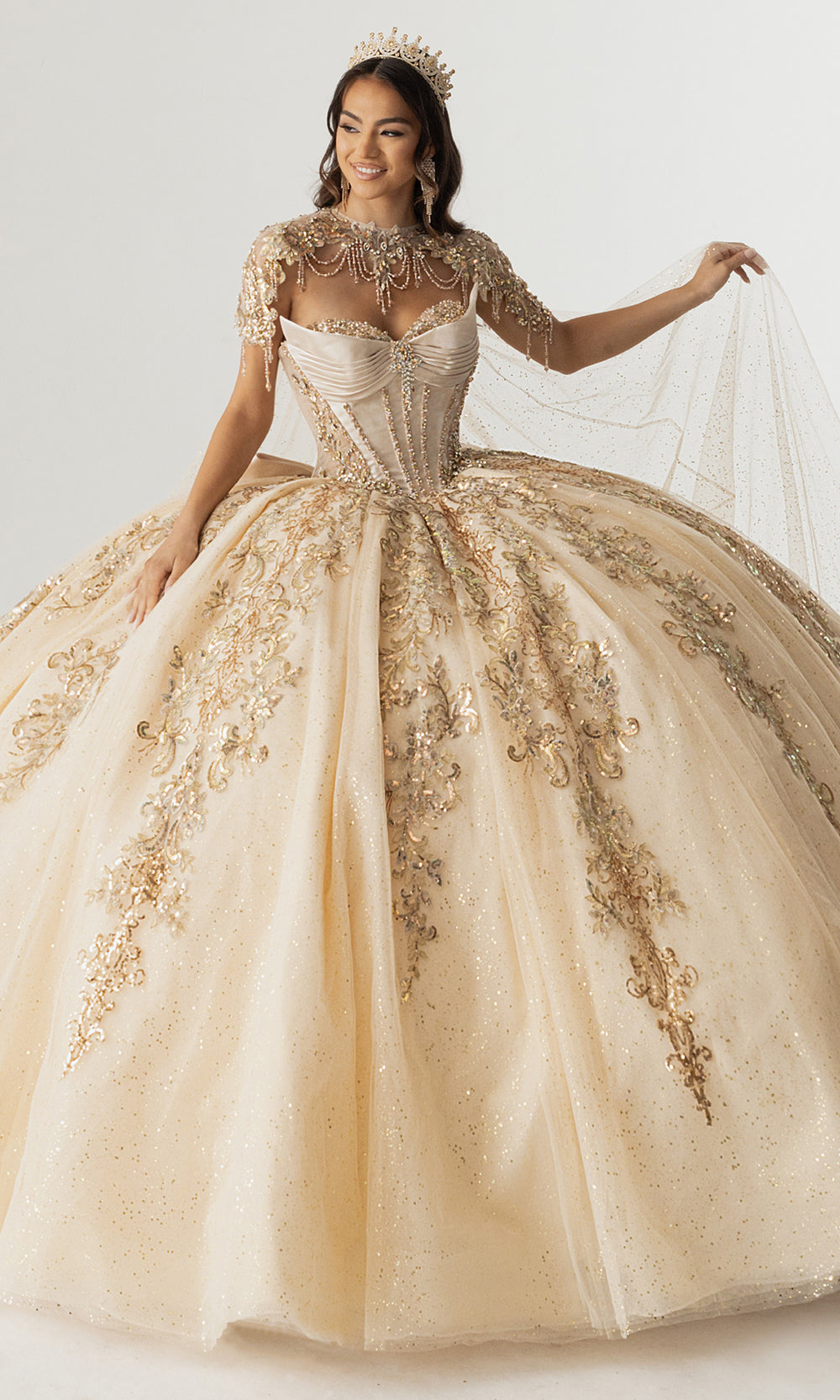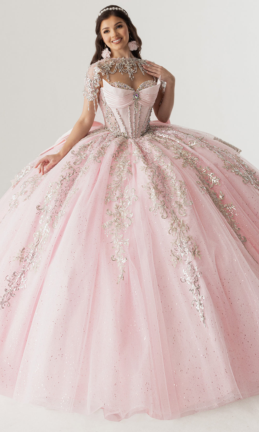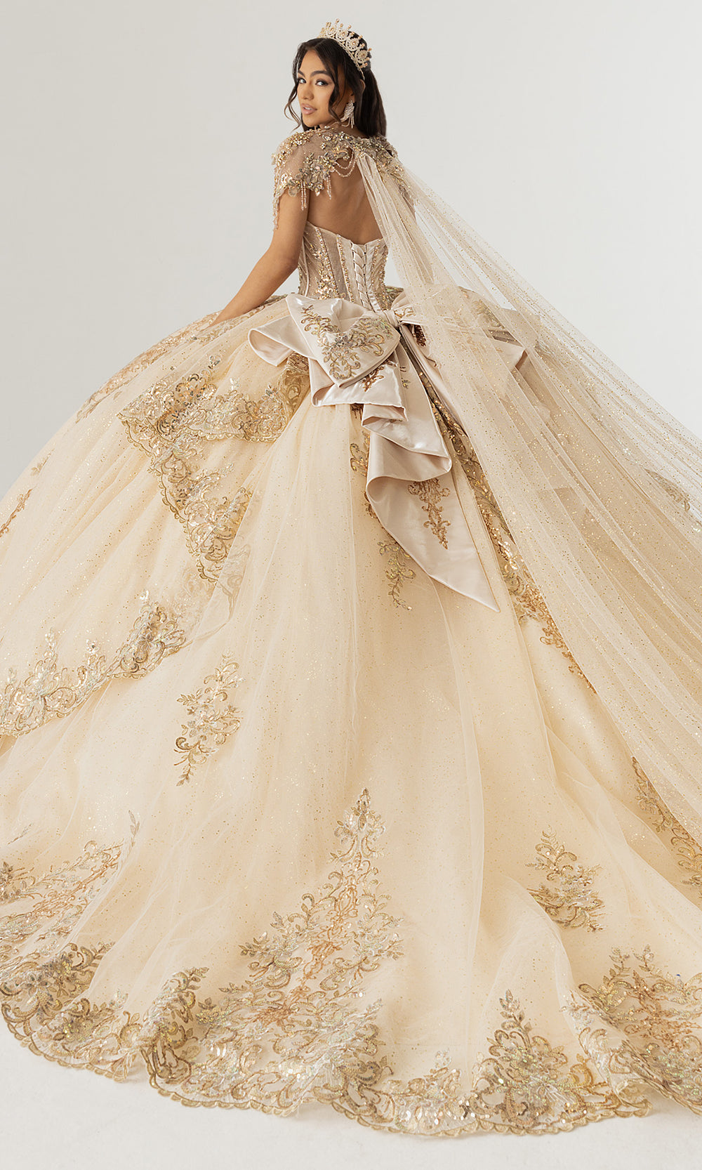 Celebrating couture craftsmanship, Rachel Allan style RQ3172 is a breathtaking quinceanera gown designed to command attention from every angle. The structured corset bodice is enhanced with shimmering sequin and applique embroidery that defines the waist while providing elegant support. A sheer illusion neckline is adorned with draped beadwork, adding refined sparkle and dimension. The voluminous glitter tulle skirt flows into a dramatic train, finished with an oversized bow at the back for a striking statement. Choose Rachel Allan RQ3172 to create an unforgettable entrance at a once in a lifetime celebration. Model is wearing Champagne Gold and Pink Silver colors.