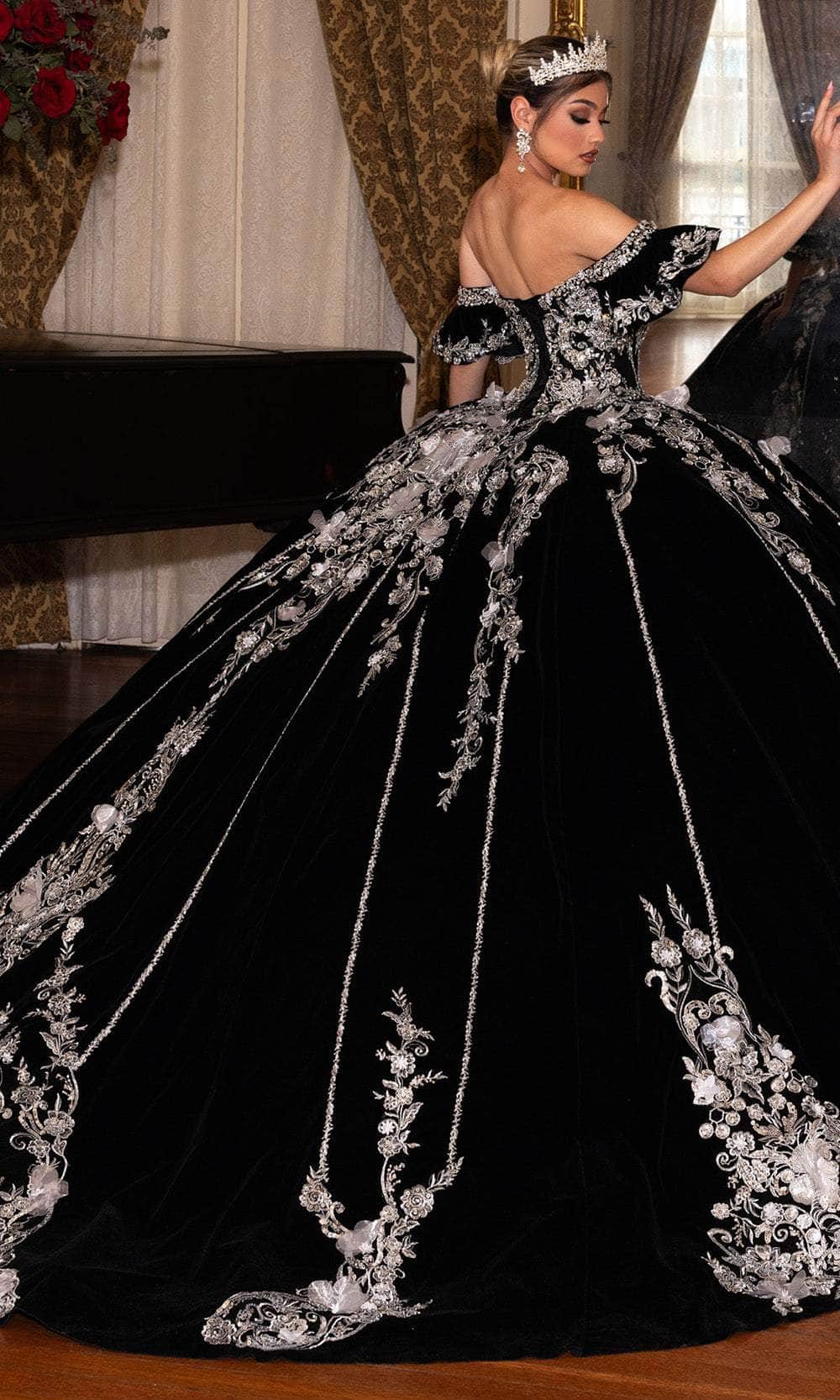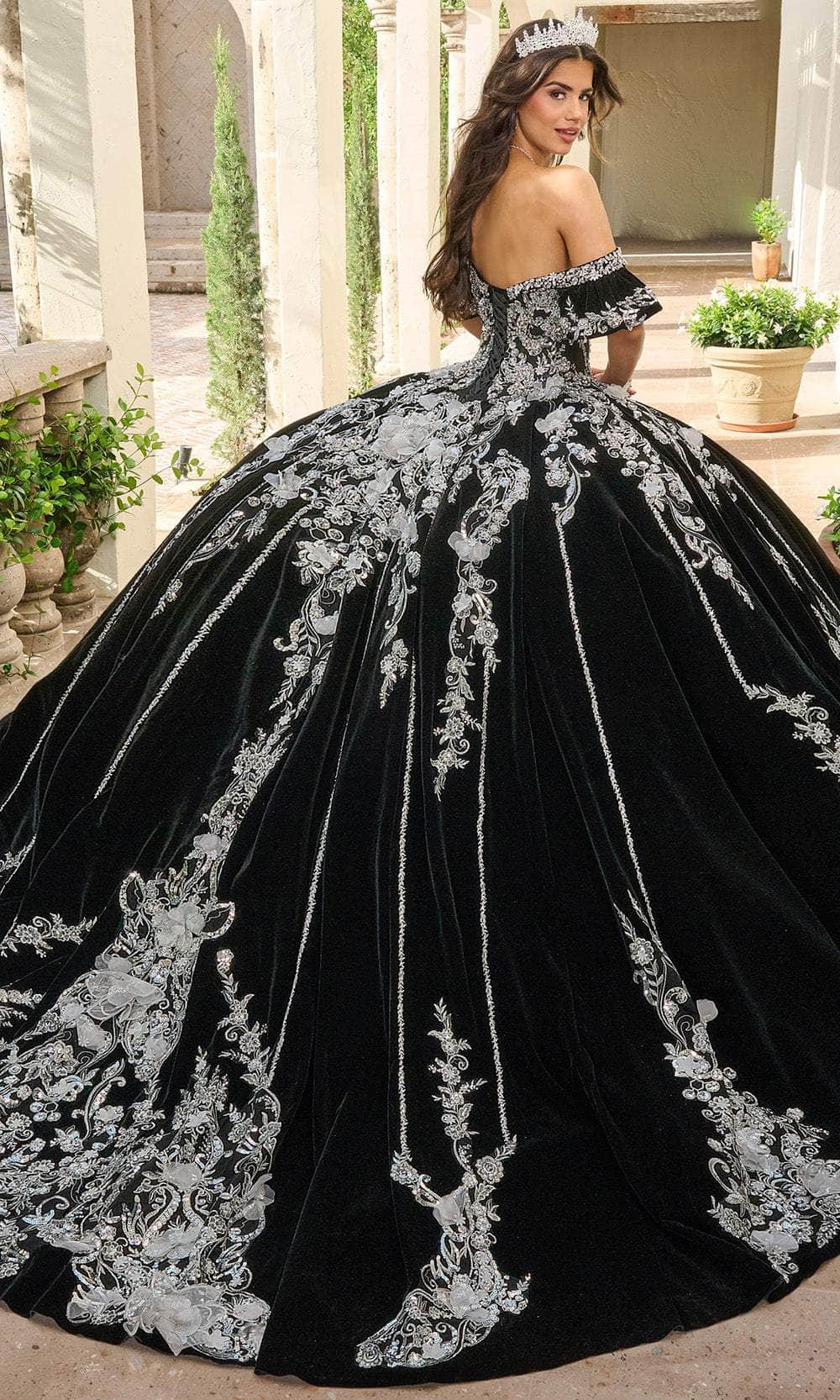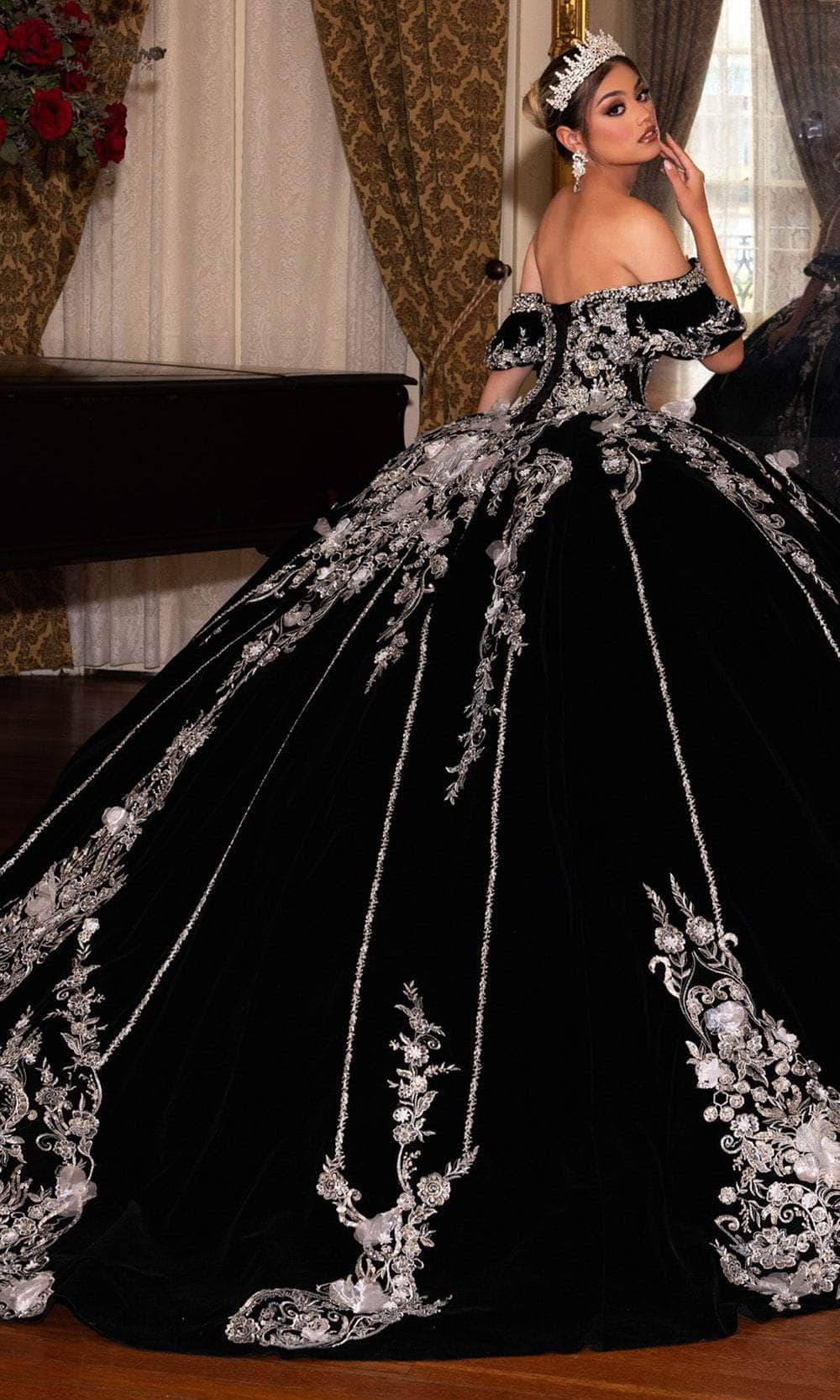 Wrap yourself in luxurious elegance with the exquisite Rachel Allan RQ5011. This striking ballgown features a luxurious velvet base adorned with silver applique and intricate beading. The off-the-shoulder sleeves and sweetheart neckline enhances the gown majestic appeal, while the 3D floral embellishments create a stunning textural contrast. A detachable bodice liner allows for a versatile styling option, making this gown a breathtaking choice for any grand occasion. The Rachel Allan RQ5011 is the epitome of royal sophistication. Model is wearing Black Silver color.