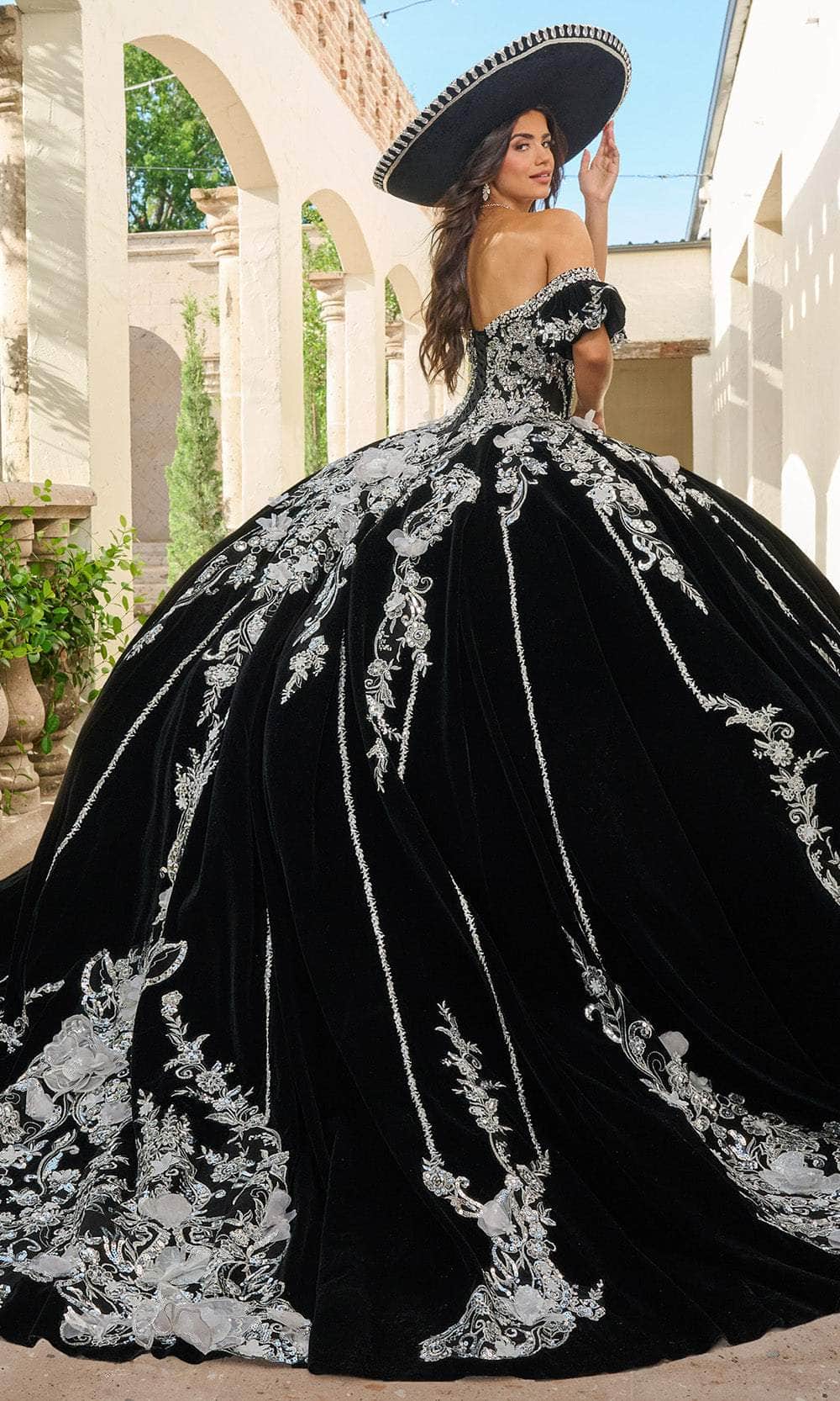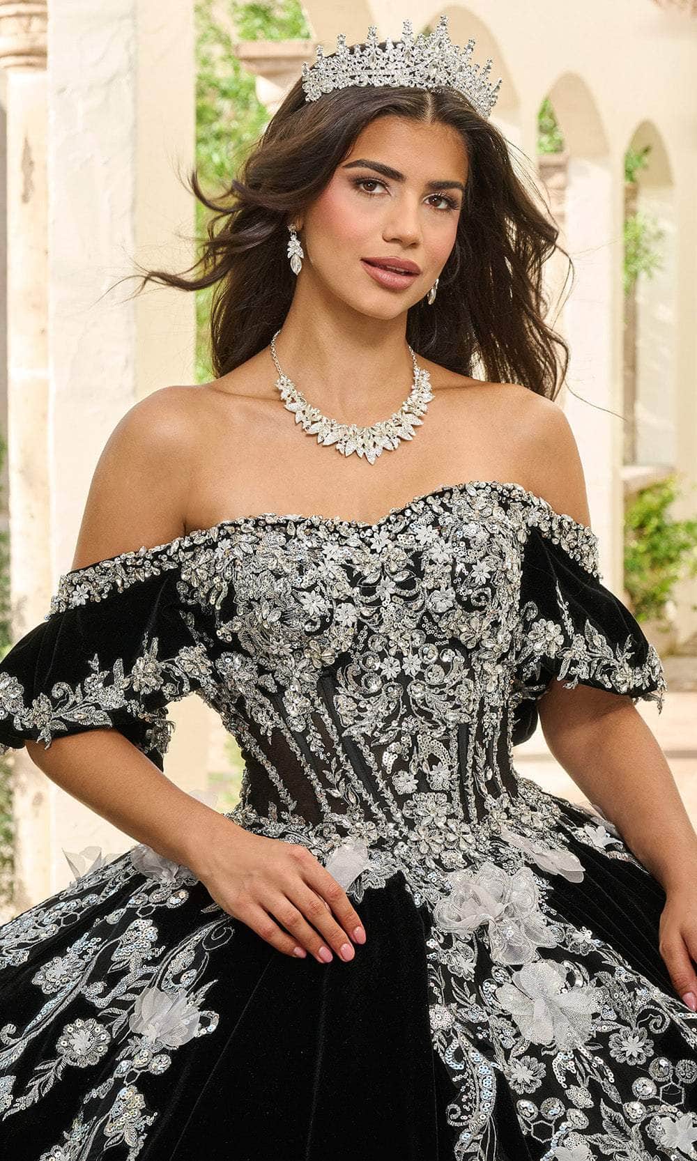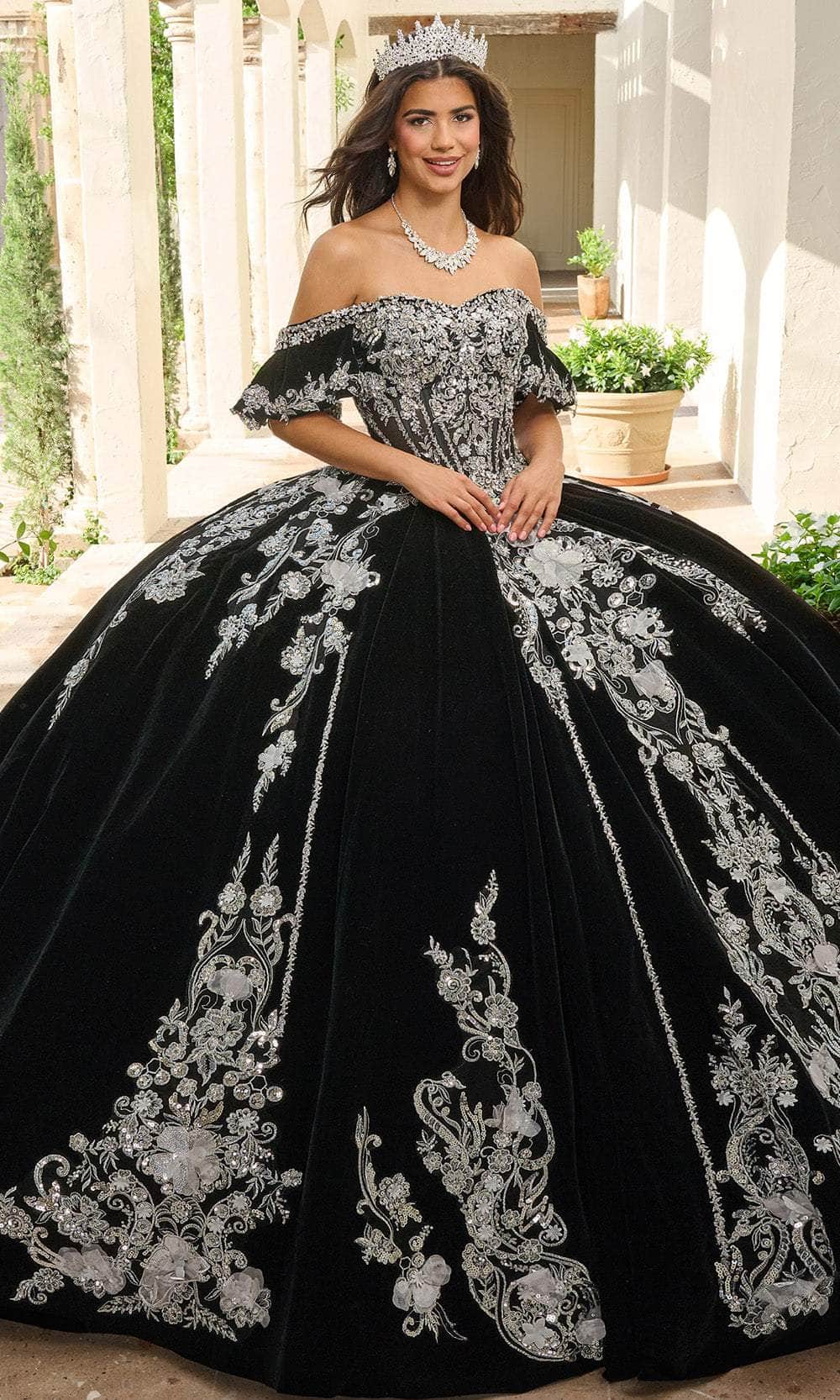 Wrap yourself in luxurious elegance with the exquisite Rachel Allan RQ5011. This striking ballgown features a luxurious velvet base adorned with silver applique and intricate beading. The off-the-shoulder sleeves and sweetheart neckline enhances the gown majestic appeal, while the 3D floral embellishments create a stunning textural contrast. A detachable bodice liner allows for a versatile styling option, making this gown a breathtaking choice for any grand occasion. The Rachel Allan RQ5011 is the epitome of royal sophistication. Model is wearing Black Silver color.