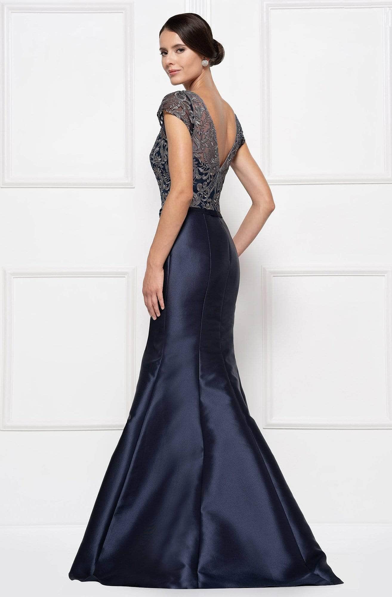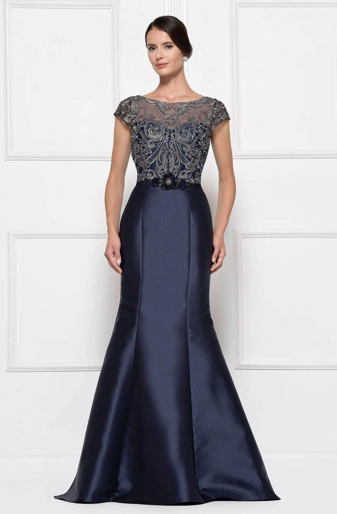 This mikado gown fashions a bateau neckline with short sleeves. The fitted bodice is adorned with embellishments and has a floral accent. The skirt forms an elegant mermaid silhouette and runs at full length. Model is wearing the Navy color.