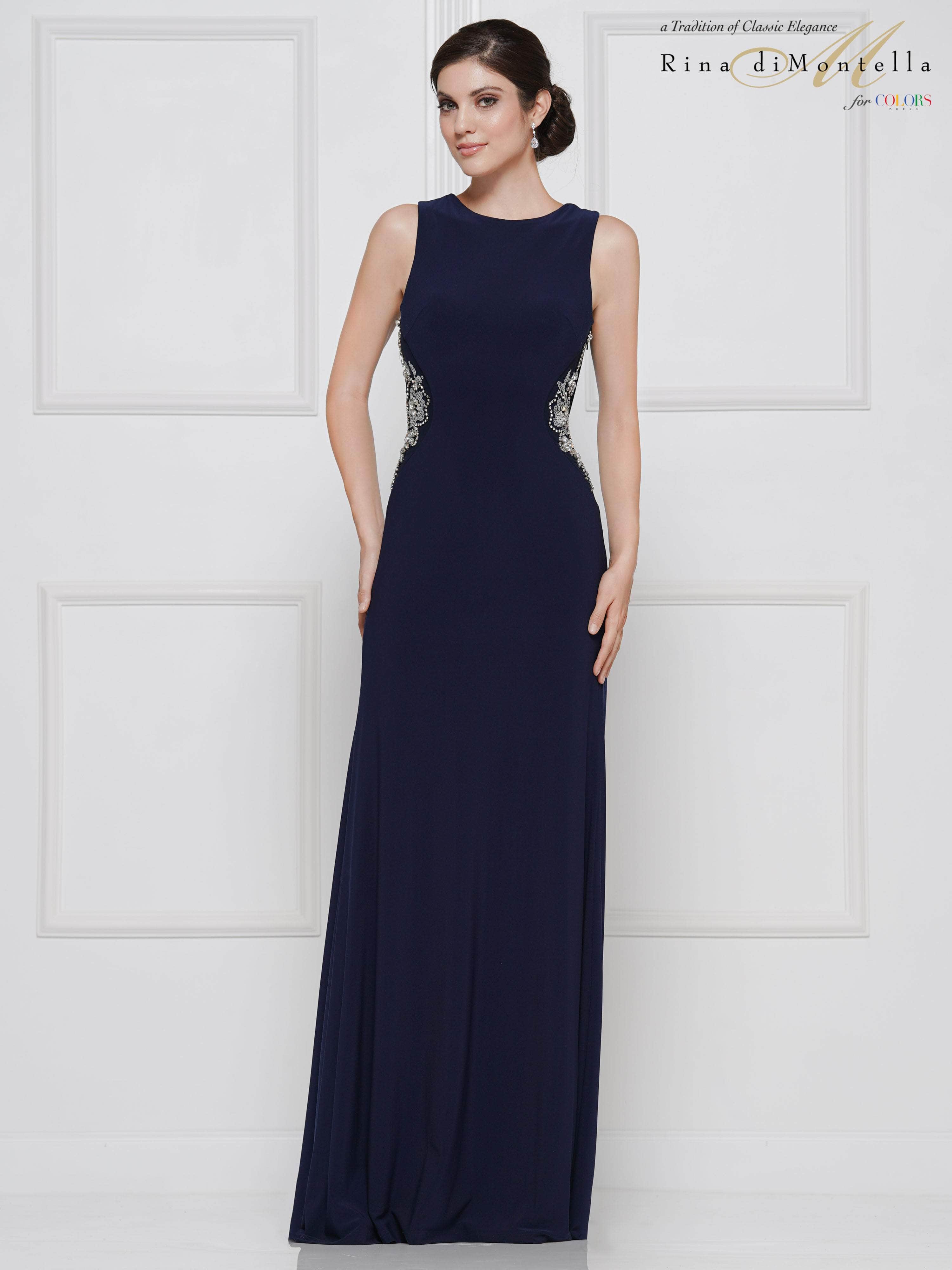 Channel your inner glamour in this jersey dress by Rina Di Montella RD2029. Features a sleeveless, bateau neckline with fitted bodice adorned with jewel accents at the back and styled in a low cowl detail. From the waist flourishes a full length sheath skirt with a dramatic sweep train. Be ready to mesmerize the night in this design by Rina Di Montella.