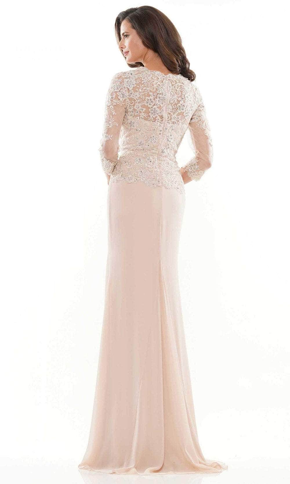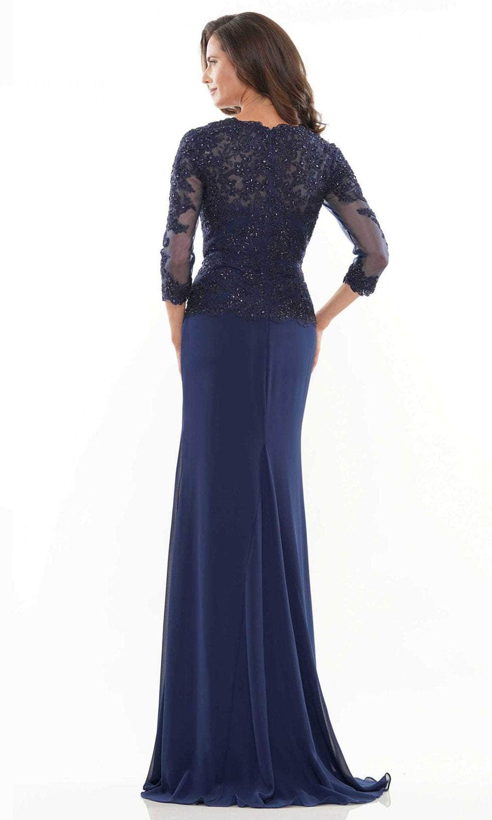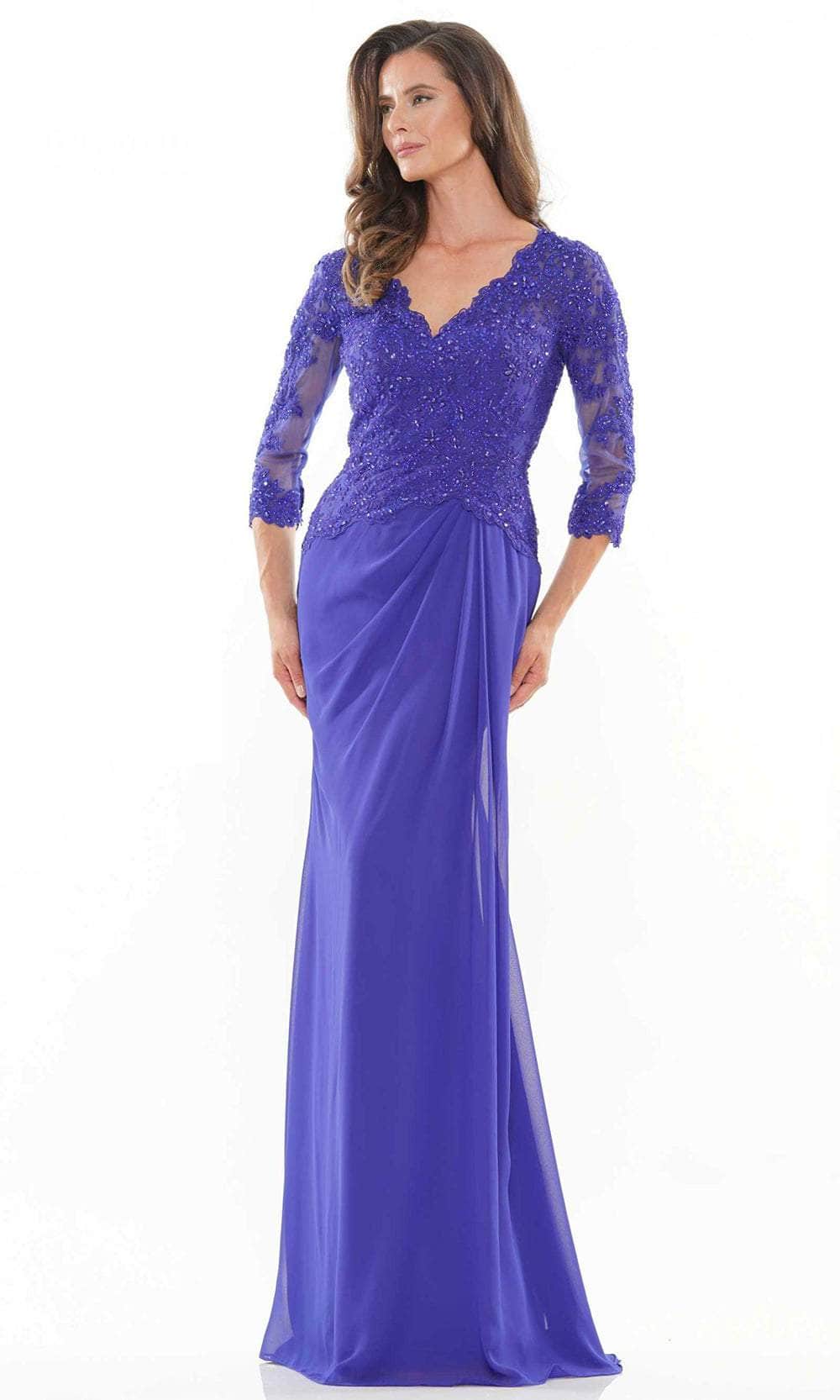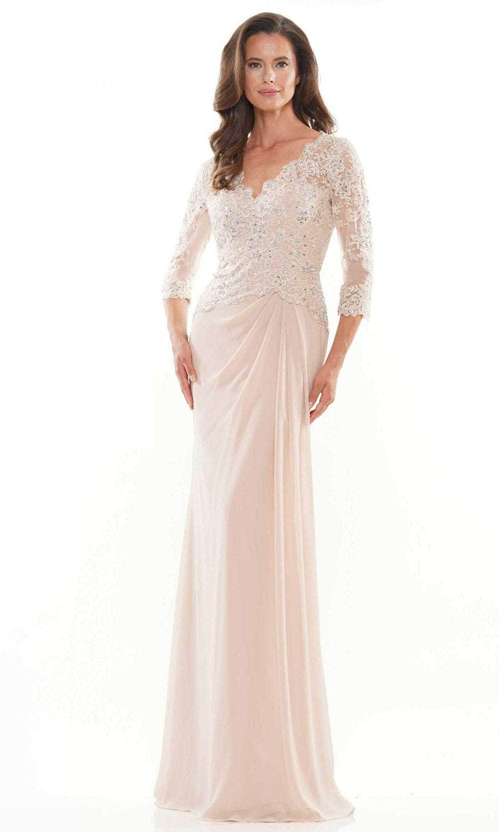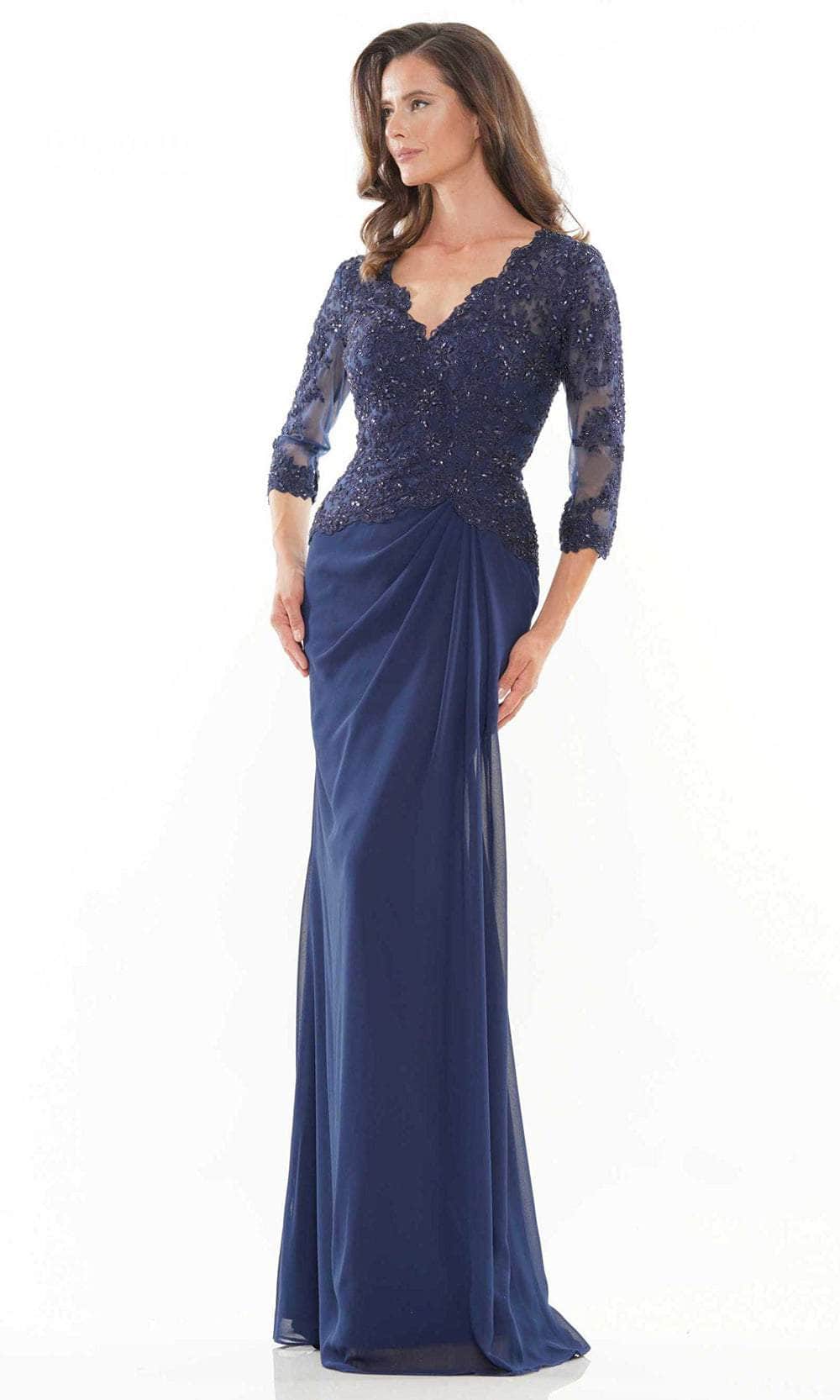 Shine with the glow of ever after in this mesmerizingly Rina Di Montella RD2744 Mother of the Bride dress. This dress as it features a fully embroidered bodice with sheer three-quarter-length sleeves, V-neckline, subtle ruched detail at the waist, and drops to the floor-length sheath skirt; the garment is closed with a back zipper closure. Orchestrate your moment to stand out in this Rina Di Montella RD2744. Models are wearing Navy, Royal, English Rose, and Mauve colors.