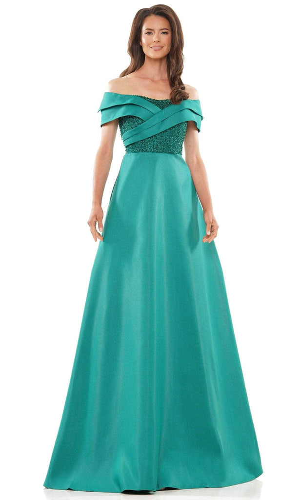 Be the one to look out for when you don this mesmerizingly designed Rina di Montella RD2812 creation. The off-shoulder sleeves bring an elegant look to this stunner. Pleated details and beaded bodice emphasizes the beauty of this winning piece which showcases a sweetheart neckline with straight-across lining. The mid-rise back is secured with a center zipper closure. The skirt that parades in an A-line silhouette gorgeously ends with a sweep train. Be a queen of your own right while looking very alluring in this Rina di Montella RD2812 masterpiece. Models are wearing the Emerald, and Navy colors.