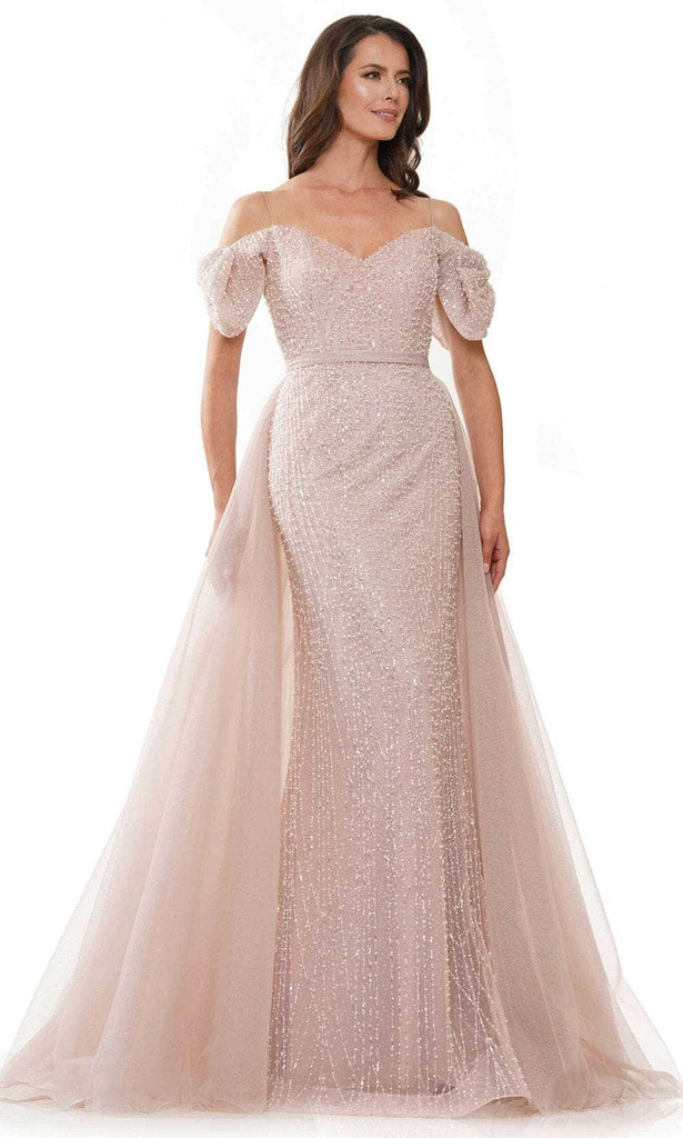 Dazzle in sophistication with the exquisite Rina Di Montella RD2942. This stunning evening dress, adorned with intricate sequins, features alluring cold shoulder sleeves and a charming sweetheart neckline, exuding timeless elegance. The floor-length sheath silhouette of the skirt is gracefully enhanced with an ethereal overskirt, culminating in a captivating train that exudes grace with every step. With a secure back zipper closure, this dress is the perfect amalgamation of contemporary allure and classic sophistication. Rina Di Montella RD2942 ensures a memorable and enchanting evening. Model is wearing Dusty Rose color.