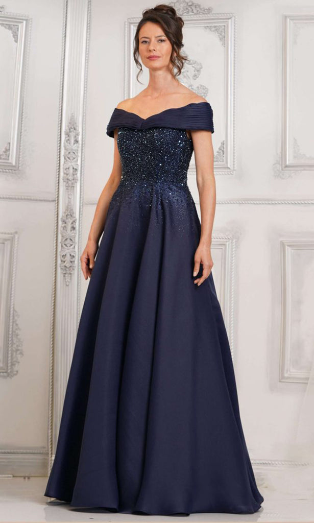 Showcase an unforgettable look with the Rina di Montella RD3102-1. Featuring a folded off-shoulder neckline that highlights the collarbones and a beautifully beaded bodice that shimmers with dimension, this dress combines timeless allure with structured elegance. Its fitted waist transitions into a full A-line skirt, delivering both presence and fluid movement. The Rina di Montella RD3102-1 is a perfect choice for creating an eye-catching yet refined impression. Models are wearing Black, Navy, Olive Mist, and Victorian Lilac colors.