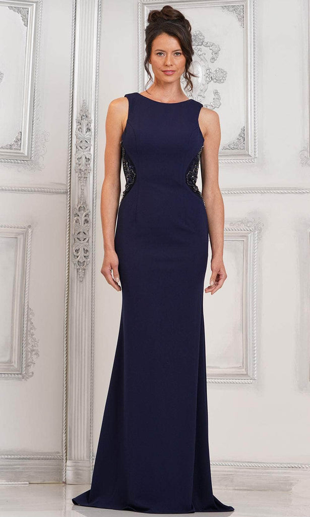 Bask in the mesmerizing romance while dressed in the Rina di Montella RD3111 evening gown. Fashioned from stretch crepe, this dress is meticulously tailored to accentuate your feminine curves, sculpting a refined silhouette. The sleeveless bodice boasts illusion sides adorned with sparkling beadwork and heat-set stones, elevating its charm. A sophisticated jewel neckline transitions into a beaded back panel, accompanied by a graceful cowl drape and concealed zipper closure, ensuring a seamless fit. The sheath silhouette gracefully descends into a sweep train, promising an unforgettable entrance. Radiate sophistication and grace with the captivating allure of Rina di Montella RD3111. Models are wearing the Navy, Seaglass, and Blue Iris colors.