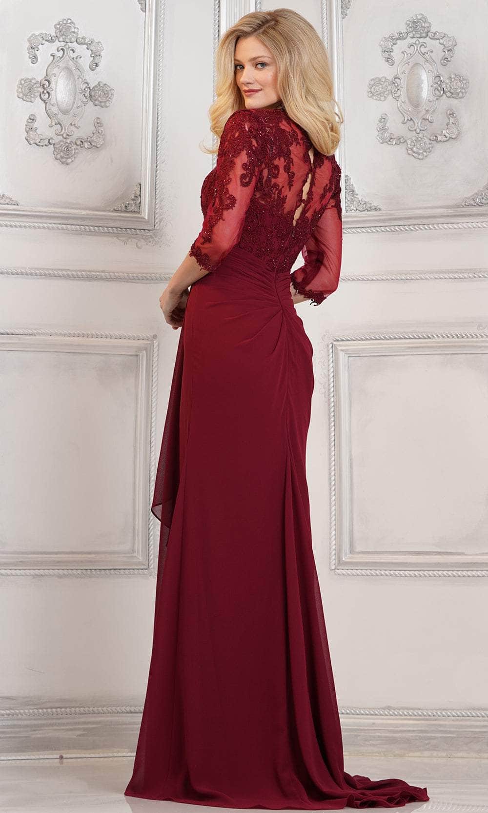 Step into elegance with the Rina di Montella RD3132, a gown designed to exude sophistication and grace. Adorned with intricate lace embroidery and delicate beading, this dress highlights timeless beauty. The striking Queen Anne neckline adds a regal touch, while sheer quarter-length sleeves and a sultry keyhole back detail enhance the overall allure. A draped bodice with subtle ruching complements the sheath silhouette, leading to a floor-length train that flows with poise.