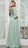 Step into sophistication wearing the Rina Di Montella RD3241 gown. This captivating design features a delicate chiffon overlay and a V-neckline with fluttery quarter sleeves, creating a fairytale effect. Embellished with beads and floral lace appliques, the gown boasts a V-shaped open back and an A-line skirt that ends in a sweeping train, perfect for making a grand entrance. Step into sophistication with the Rina Di Montella RD3241 evening gown. Models are wearing the Black, Navy, and Light Sage colors.