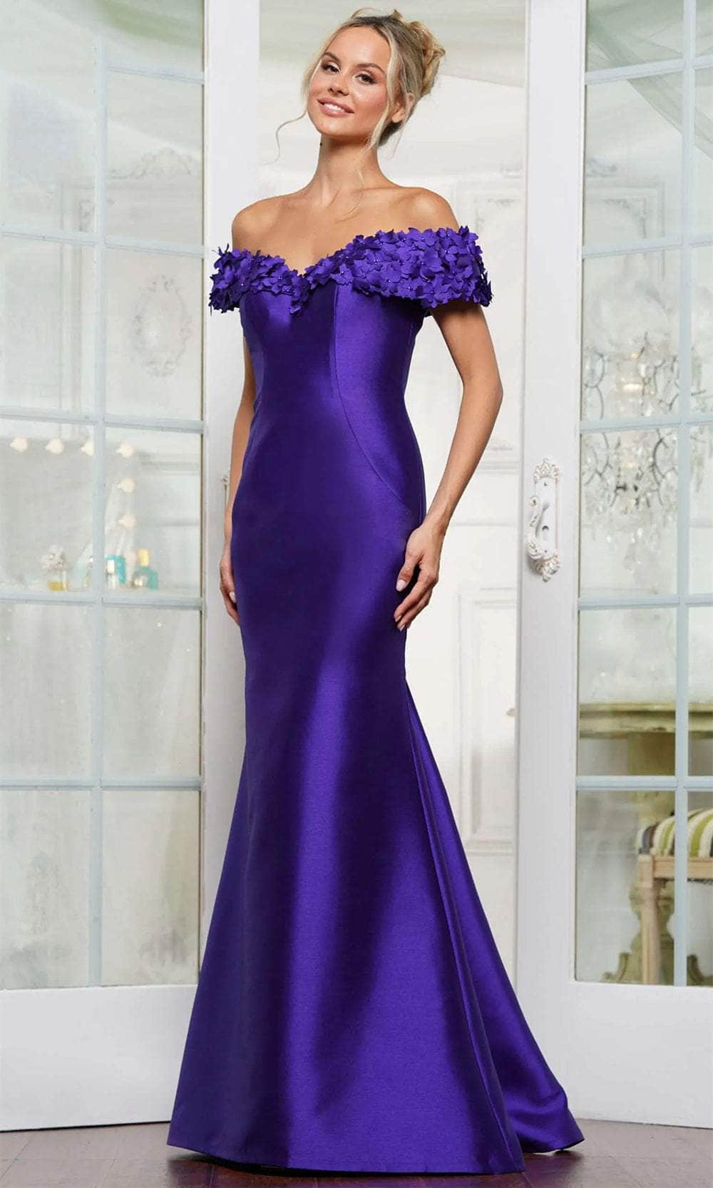 Elevate your formal ensemble in the Rina Di Montella RD3254. This luxurious gown features sumptuous dupioni fabric, a floral-adorned off-shoulder neckline, and delicate beading for an elevated finish. The fitted silhouette leads to a flared mermaid skirt and sweep train, creating drama and poise in every step. A graceful choice for weddings, galas, or red-carpet affairs. Shown in Black, Emerald, Magenta, and Amethyst.