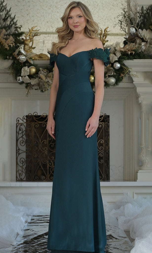 Discover a stunning appearance with the Rina di Montella RD3325-1. This floor-length dress showcases an off-shoulder neckline enhanced by cap sleeves, bringing a touch of softness to the fitted design. Its sheath silhouette offers a flattering shape that elongates and enhances the wearer figure. Leaf lace applique combined with beading creates an elegant finish along the sleeves. Perfect for those who appreciate graceful simplicity with thoughtful detailing, the RD3325-1 brings sophistication to any occasion. Models are wearing Forest, Rose, and Wine colors.