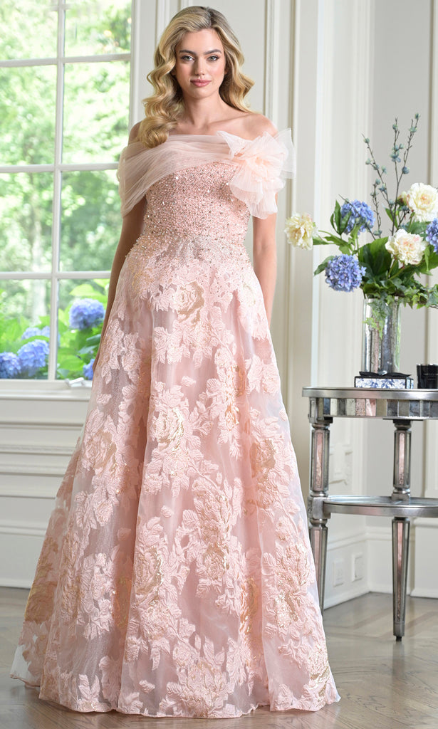 Bring romantic flair to formal dressing with the Rina di Montella RD3406-1 style. Its tulle off-shoulder neckline pairs perfectly with a delicately beaded bodice that sparkles with understated charm. A natural waistline defines the figure while the full-length A-line skirt moves gracefully. Floral texture and beading decorates the gown, adding depth and a soft feminine touch. Select the Rina di Montella RD3406-1 gown to create a breathtaking presence at your next special occasion. Models are wearing Blush, and Seaglass colors.