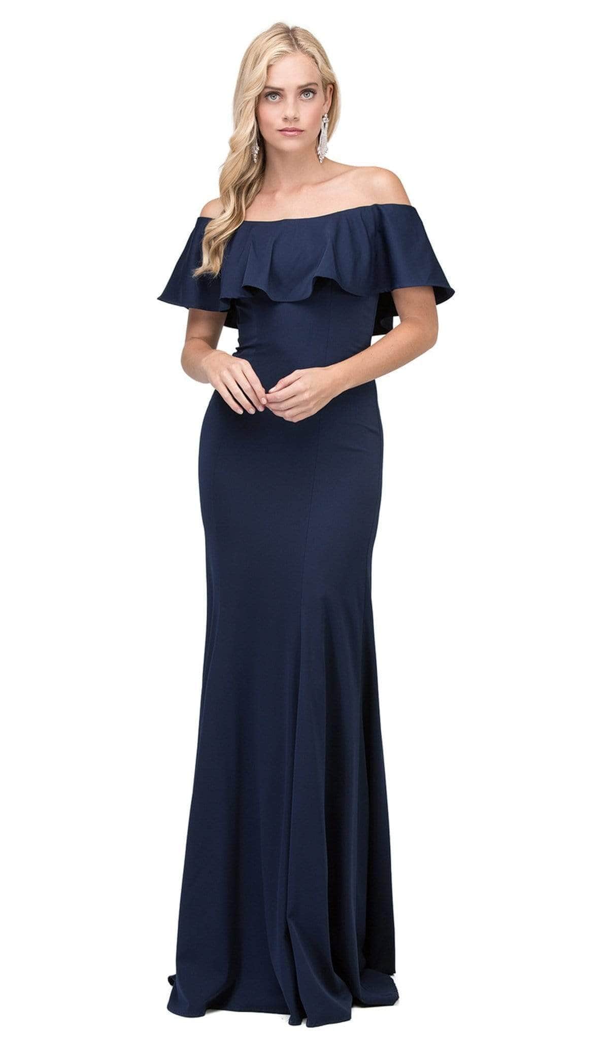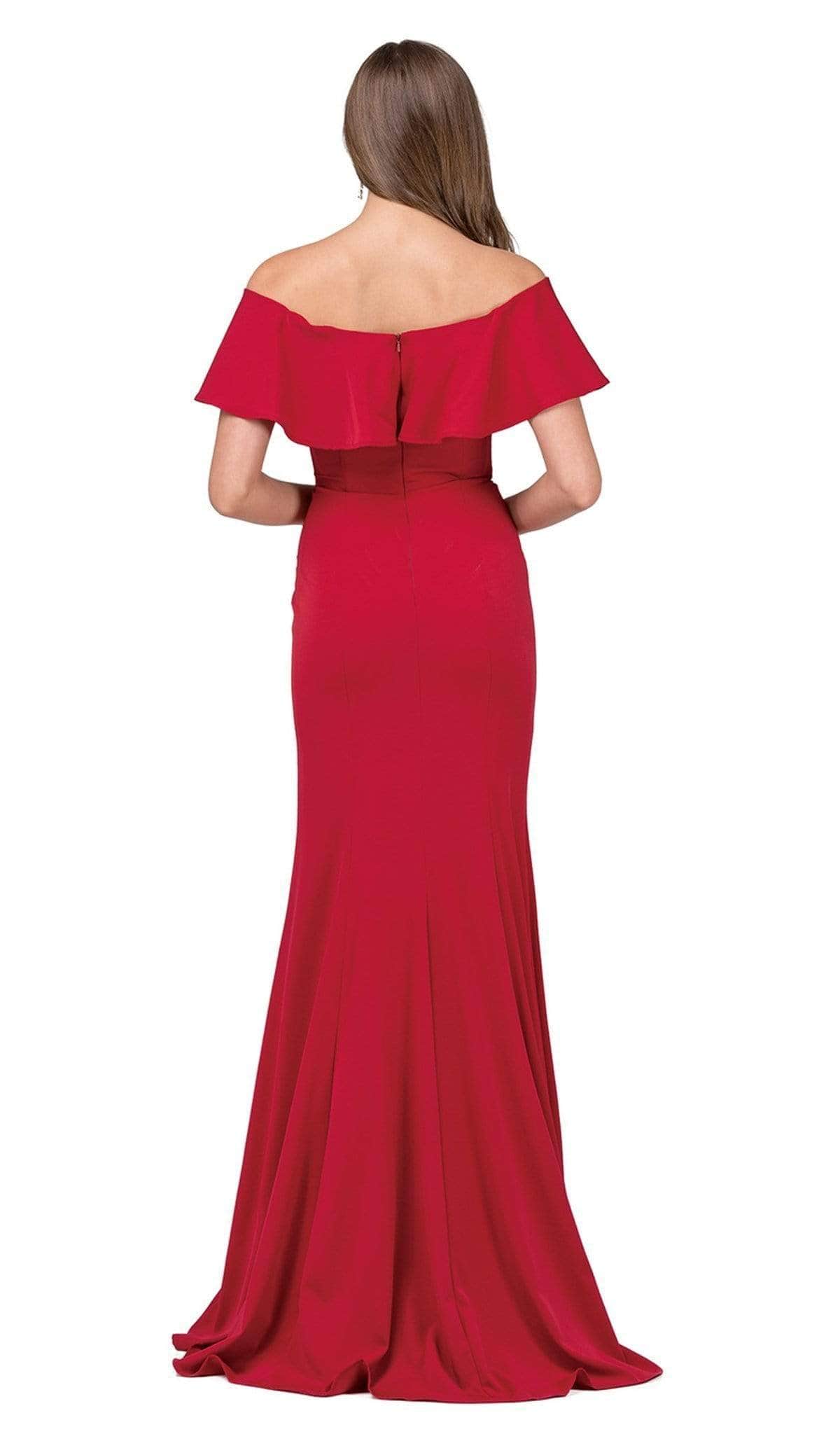 Express your unique persona and classic sophistication in this evening dress by Dancing Queen - 2348. Crafted to absolute perfection, this long dress is designed with an off-shoulder neckline on a fitted bodice framed with ruffled sleeves. It reveals a mid-open wide scoop back with a back zipper closure for a perfect fit. From its natural waist, the slightly flared soft pleated skirt flourishes to a sheath silhouette as it cascades to a floor-length hemline. A sweep train completes the dress. This masterpiece by Dancing Queen - 2348 will definitely parade your elegant and classy style on your next formal occasion. Models are wearing Burgundy, Navy, and Plum colors.