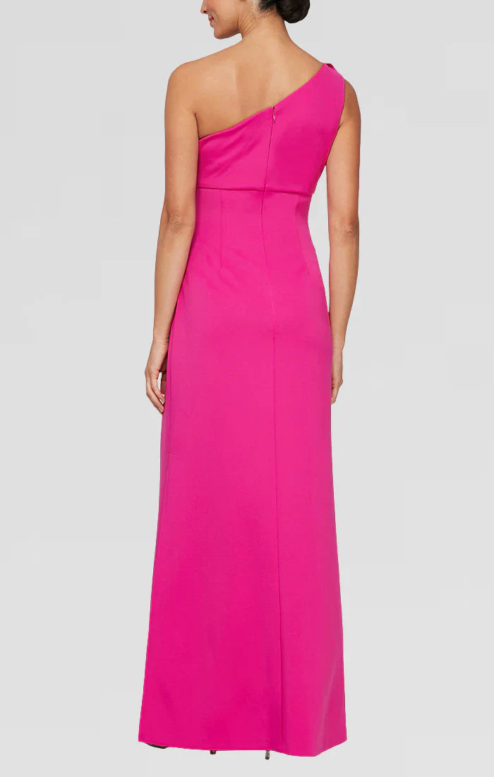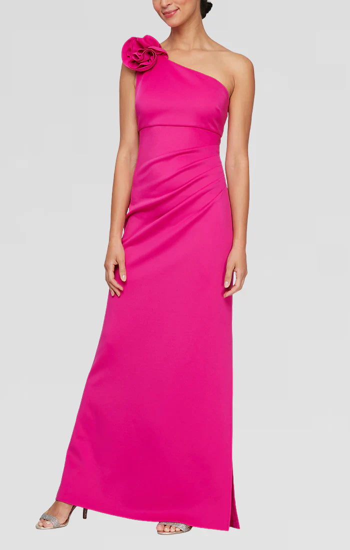 | Details: | 3d-Floral accent shoulder, Ruching, Fitted, High slit |