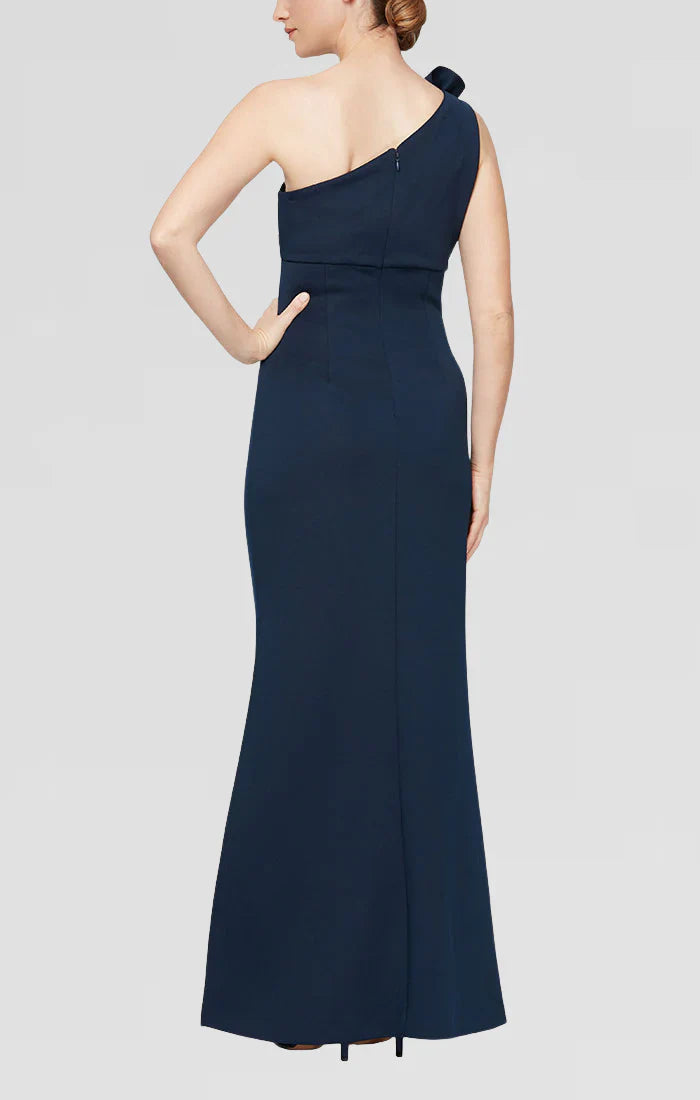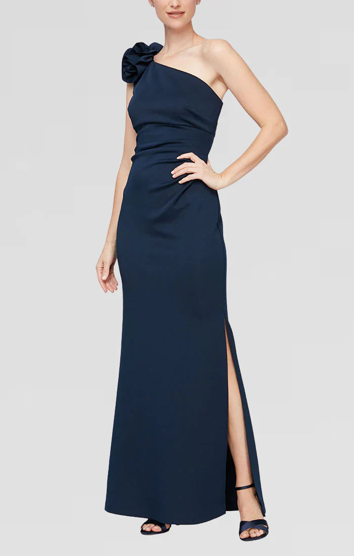 S.L. Fashions 9134208 is a stunning choice for any evening event. It features a one shoulder neckline with a 3d-Floral embellishment that adds a touch of glamour. The bodice is ruched to accentuate your curves, and the skirt has a high slit for a sexy flair. The dress is made of stretch material that hugs your body and offers comfort. S.L. Fashions 9134208 dress is a simple but elegant way to elevate your look. Model is wearing Navy color.