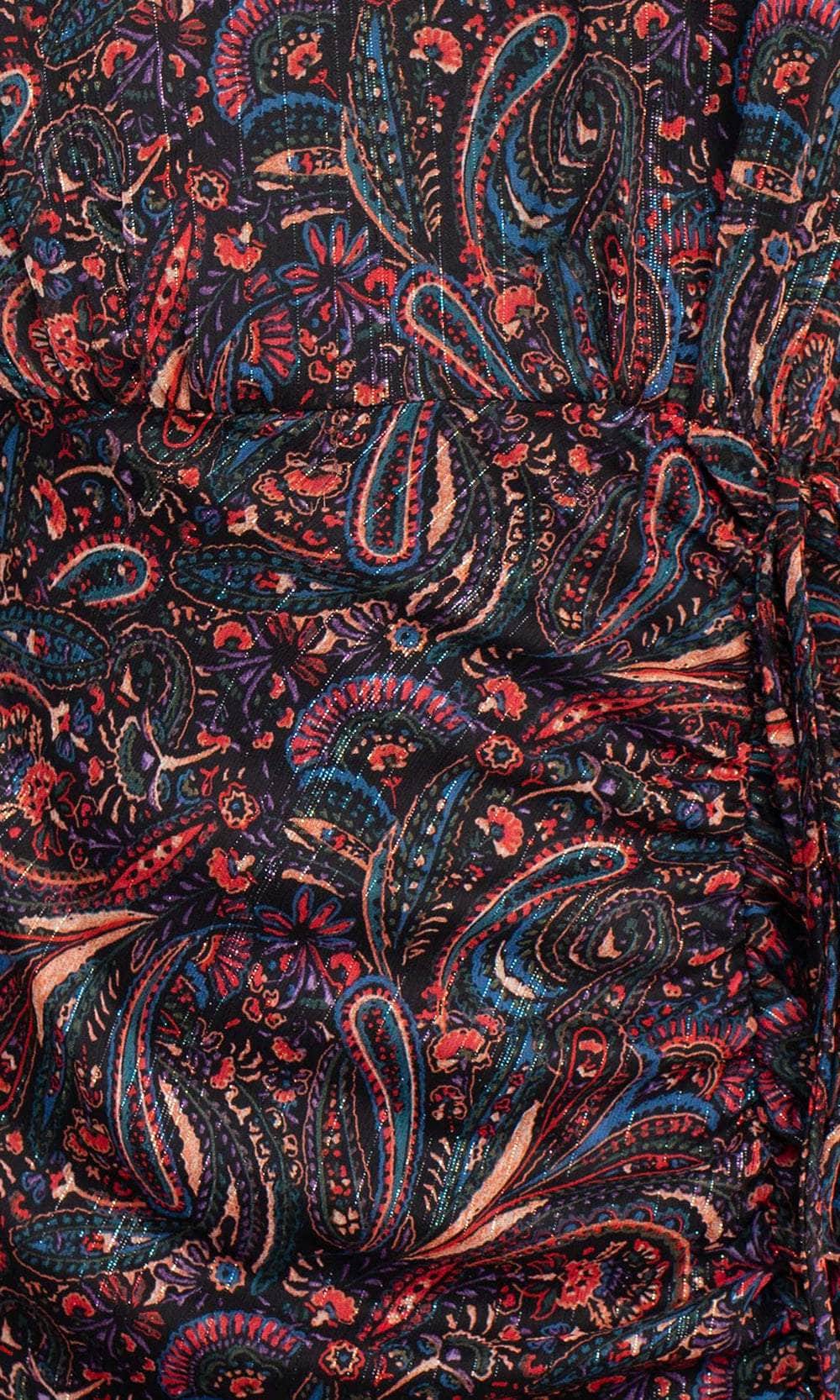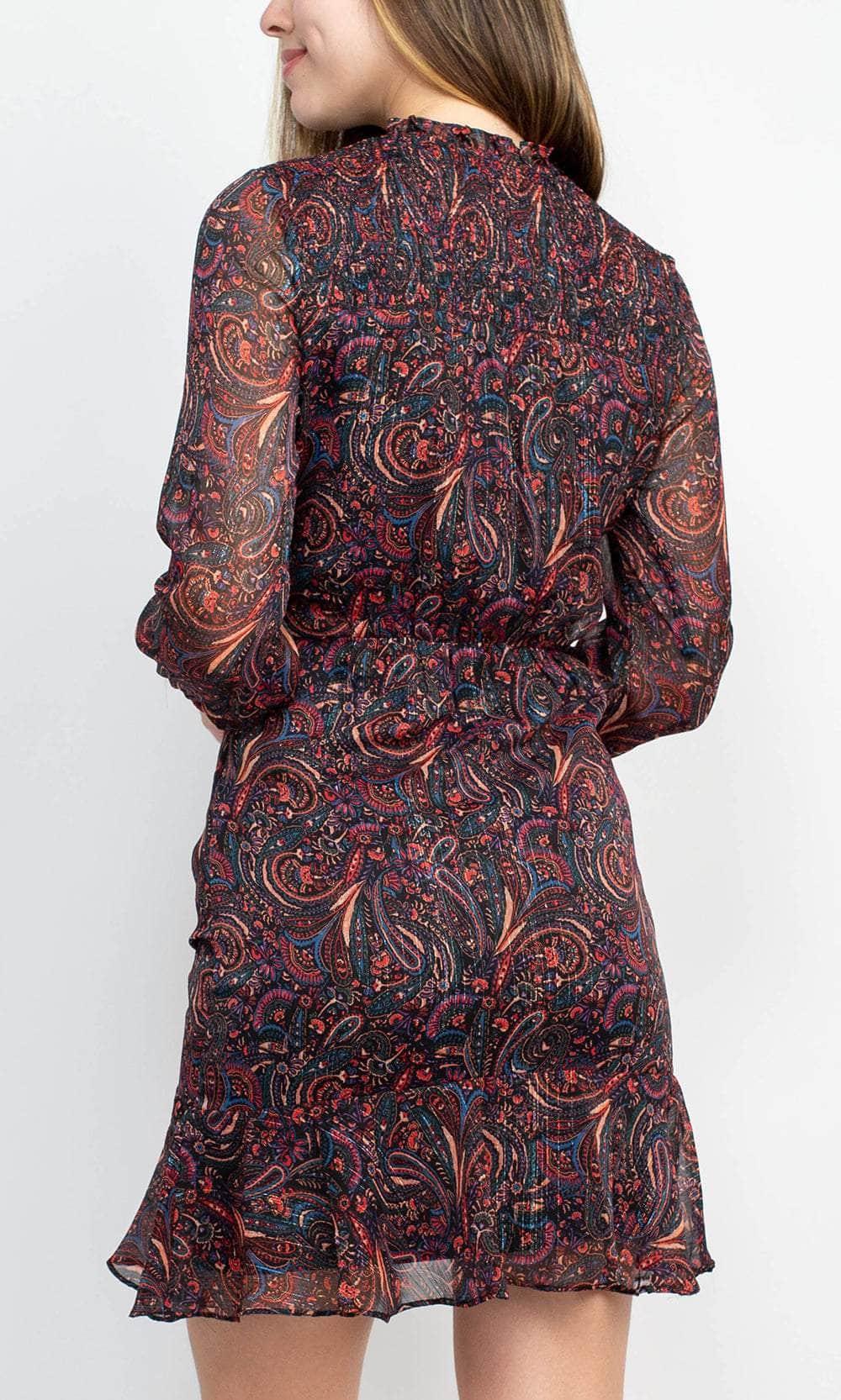 Glow as you catch a glint of sparkle in his eyes in this fascinatingly styled Sage Collective SU07D15 creation. Accented with sculpting seams on a paisley printed silhouette in a multi-colored spectacle, this piece features a v-neckline with ruffled collar trims. Flaunting sheer bishop sleeves with elastic cuffs, adjustable ruching crafts the trumpet skirt with its ruffled paneled hem. Lavish in the magnificence and beauty of this sophisticated Sage Collective masterpiece. Model is wearing the Multi color.