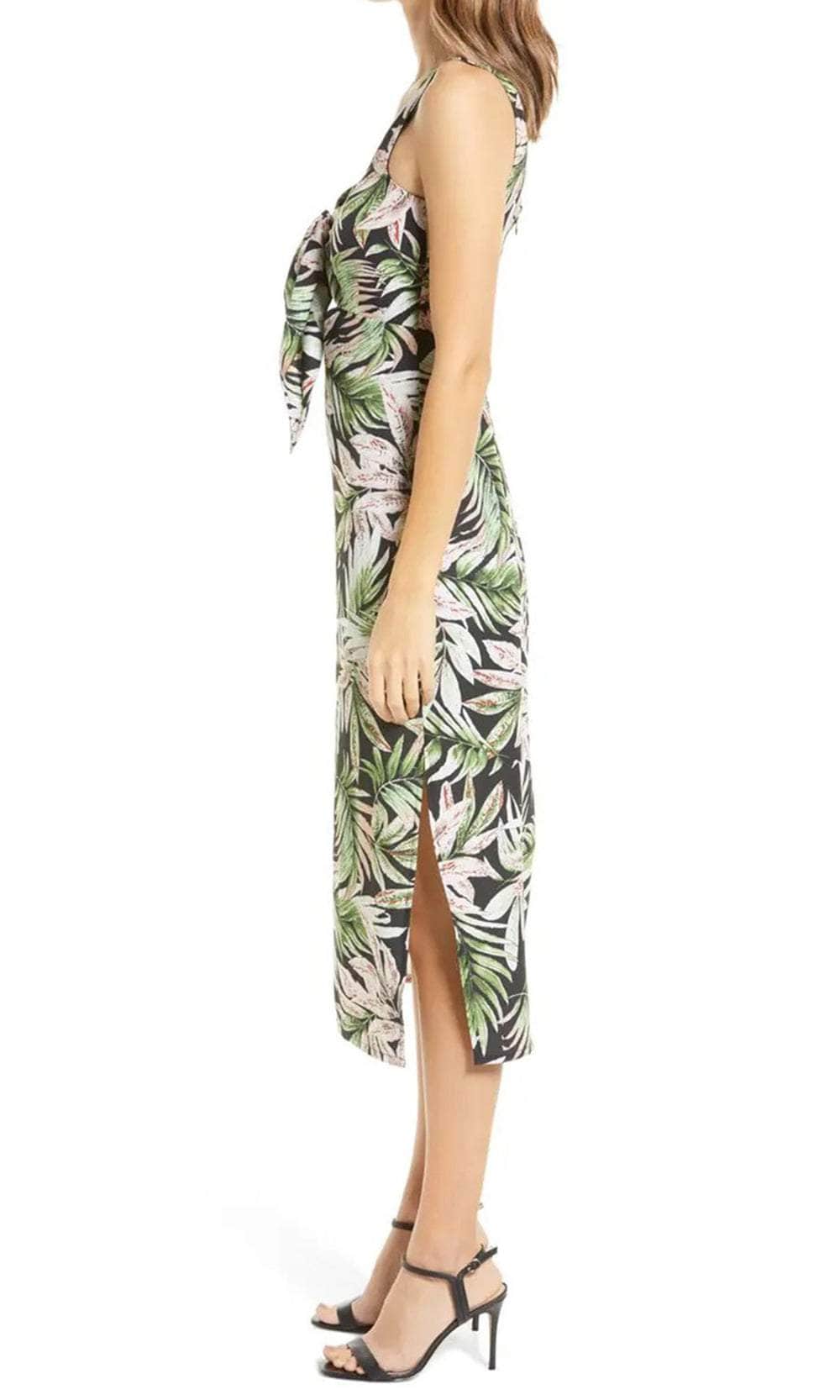 Look perfectly feminine in this exquisite Sam Edelman 10F629 masterpiece. Detailed with eye-catching palm prints, this form-fitting dress has a gorgeous v-neckline with a cutout and tie front design. The sleeveless bodice is supported by wide shoulder straps that lead to the mid-open square back. Revealing a side slit, the sheath skirt skims into a tea length hem. Be adored by the beautiful crowd in this Sam Edelman 10F629 creation. Model is wearing the Black Multi color.