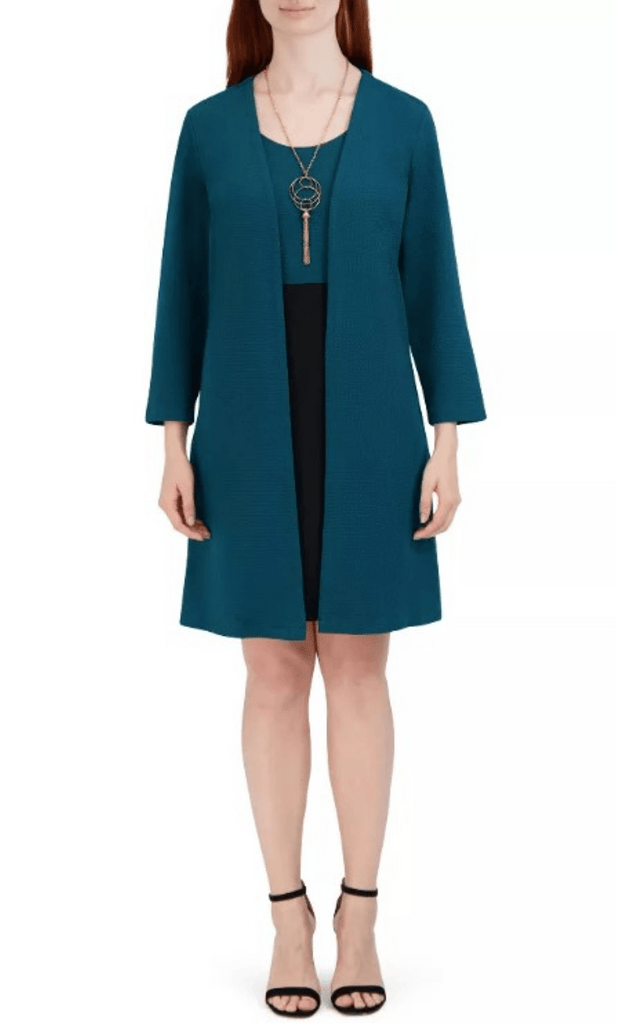 You are more than gorgeous when you wear this unbeatable dress from Sandra Darren 75869. Can be worn from desk to party with its two style. This two-piece dress can be word without the jacket and with it. Opens in a low round neckline and is paired with a jacket that reaches the knee length and uses long sleeves. The inset dress has two tones and can be worn as casual wear. Create magical moments as you revel in Sandra Darren 75869. Models are wearing Mallard Black and Red Black colors.