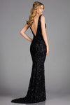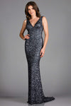 Make a sophisticated statement in this glittery dress by SCALA 48883. This fully sequined dress mesmerizes in a sleeveless, plunging V-neckline with a fitted bodice. The back flaunts a low V-cut while the skirt flourishes in a sheath silhouette to a sweep train finish. Get ready to be captured in picture of sophistication in this dress by SCALA.