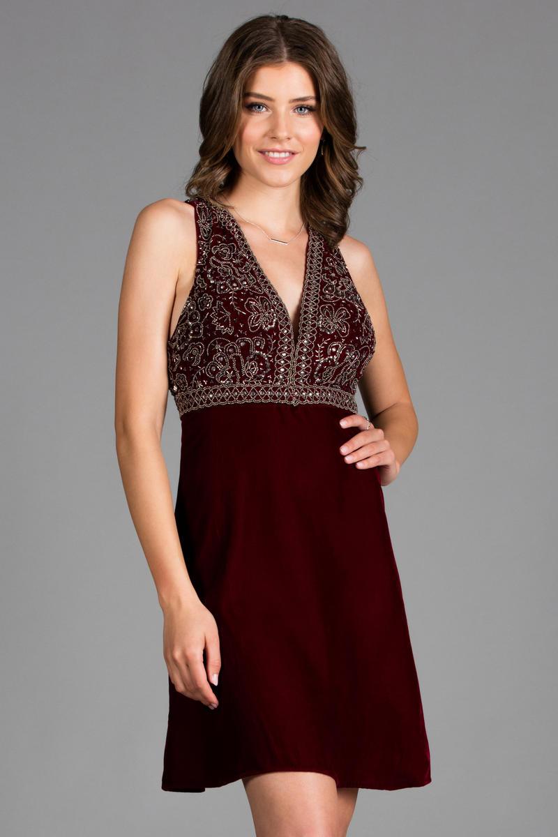 | Details: | Sleeveless, Beaded bodice, Plunging neckline, Velvet, Racerback, Back zipper, A-line skirt |