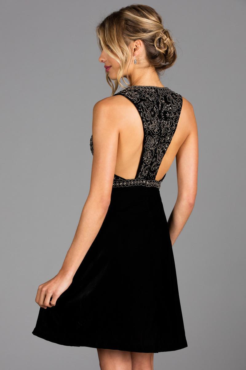 Walk in glamour and let all heads turn on you in this creation by SCALA 48913. Graces in a sleeveless, plunging V-neckline with fitted bodice adorned with intricate patterns of bead embellishments. This velvet dress has a racerback style with a zipper closure and a modest A-line skirt that runs at mid-thigh hem. This SCALA look is sure to make a daring statement in your special affair!