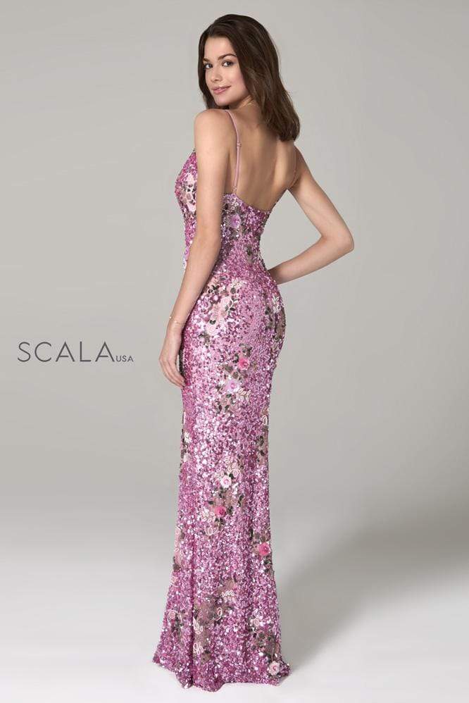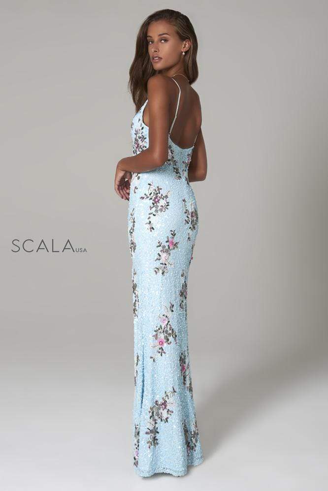 Envision the ideal evening in this evocative formal dress by SCALA 48965. Showcases a sleeveless, plunging V-neckline with spaghetti straps. The fitted bodice has a scoop back while the skirt fashions a full length sheath skirt with a mini train. Giving that glitz and glamour, the dress is designed with floral sequins allover. Look like a siren in a melodic gown by SCALA. Model is wearing Black/Multi color.