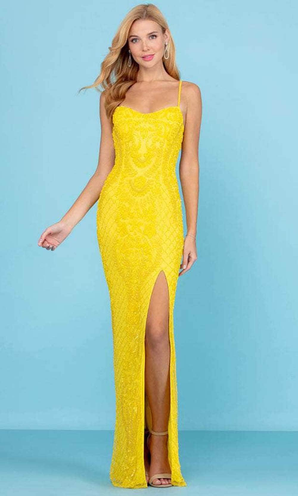 Show off your trendsetting style when you wear this by SCALA 60211. This ensemble showcases a sleeveless bodice with a scoop neckline richly decorated with embellishments of gleaming sequins and beads and held by spaghetti straps that gorgeously lead to a cutout back with a back zipper closure. The skirt parades dramatically in a sheath silhouette accentuated with a thigh-high slit. Embrace a style that is immaculately sultry as you glam up for your event in this SCALA creation. Models are wearing Sunflower, Black, Black/Gold, Dolphin/Pearl, New Rose, and Petal Silver colors.