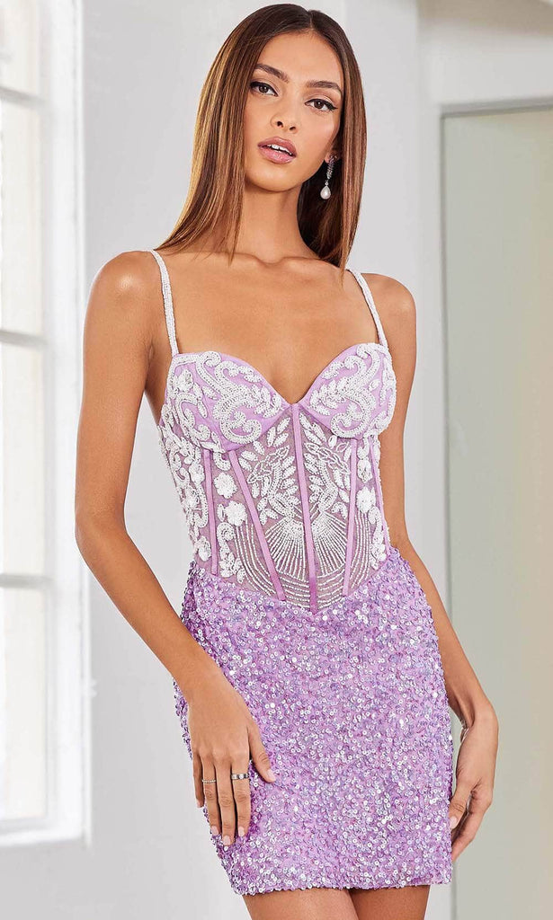 Show off your trendsetting style when you wear this Scala 60318. It features a sweetheart neckline with slender straps, and a fitted bodice contoured with corset boning to emphasize your sexy curves. Paired with a basque waistline, the back also shows boning structure with a zipper at the middle for a secure fit. The skirt, which ends at the mid thigh hem matches the embellishments of its bodice with its sparkling sequins. his Scala will make you glow all night long and will flatter you from every angle. Models are wearing Turquoise, and Violet/Pearl colors.