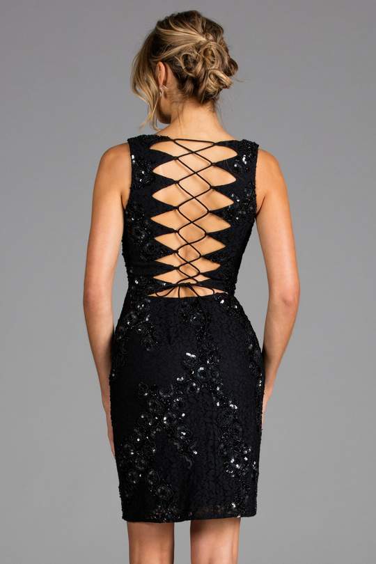 This figure flattering semi-formal dress features a sleeveless, V-neckline frame and well detailed cut-out lace up back. Beautifully fabric in lace and intricately ornate with hand beaded floral embellishment, this sexy and romantic ensemble finishes at mid-thigh length.