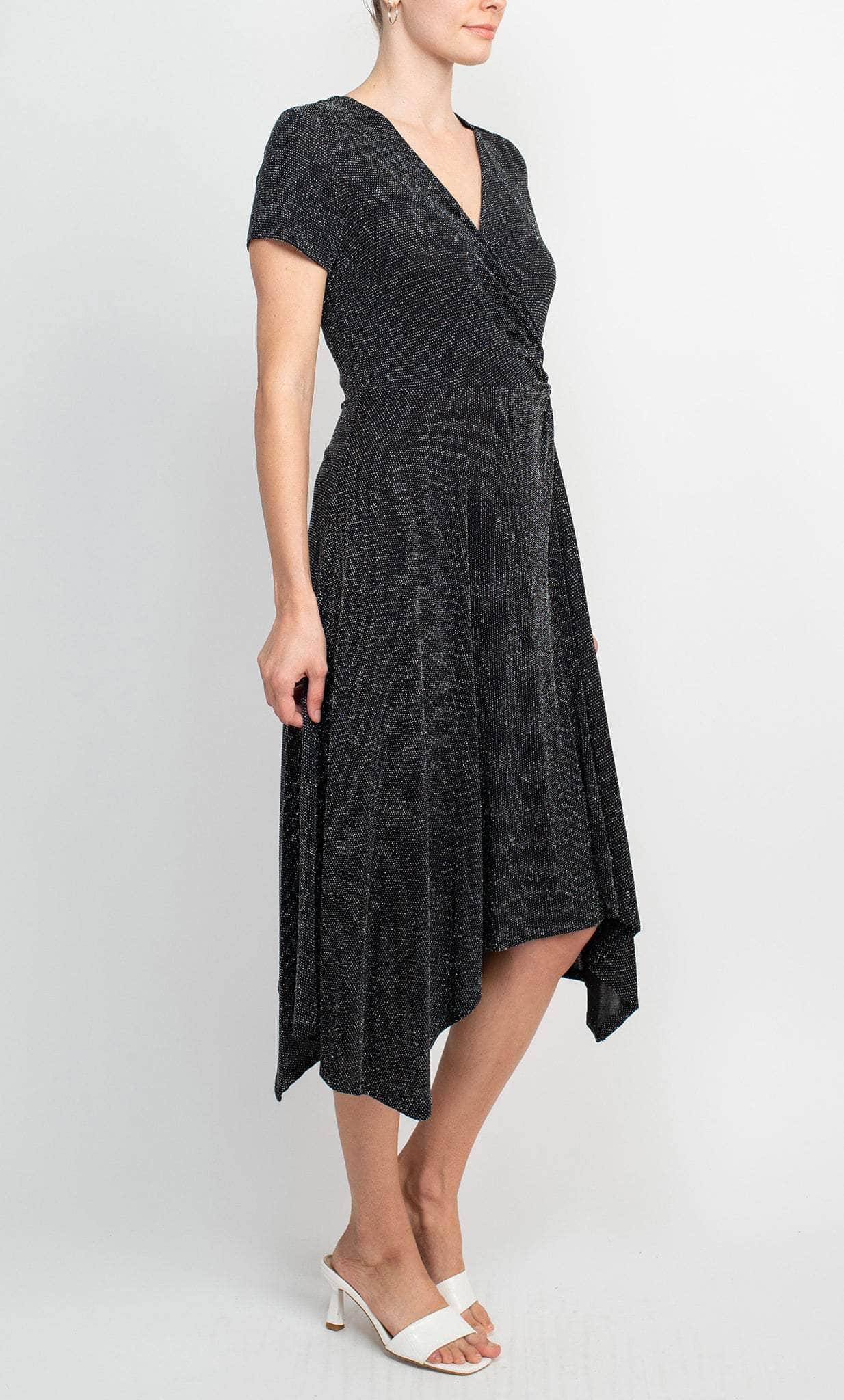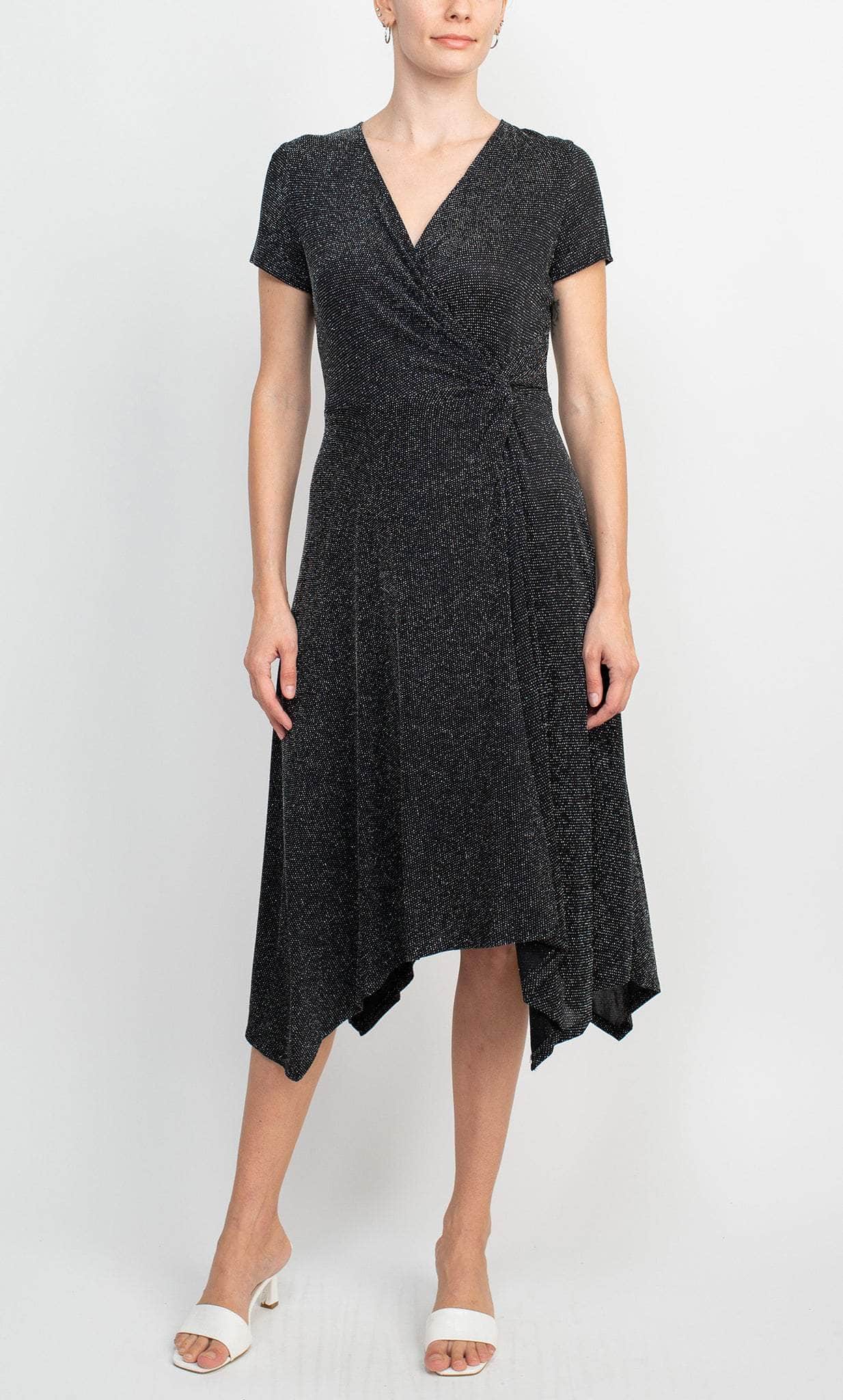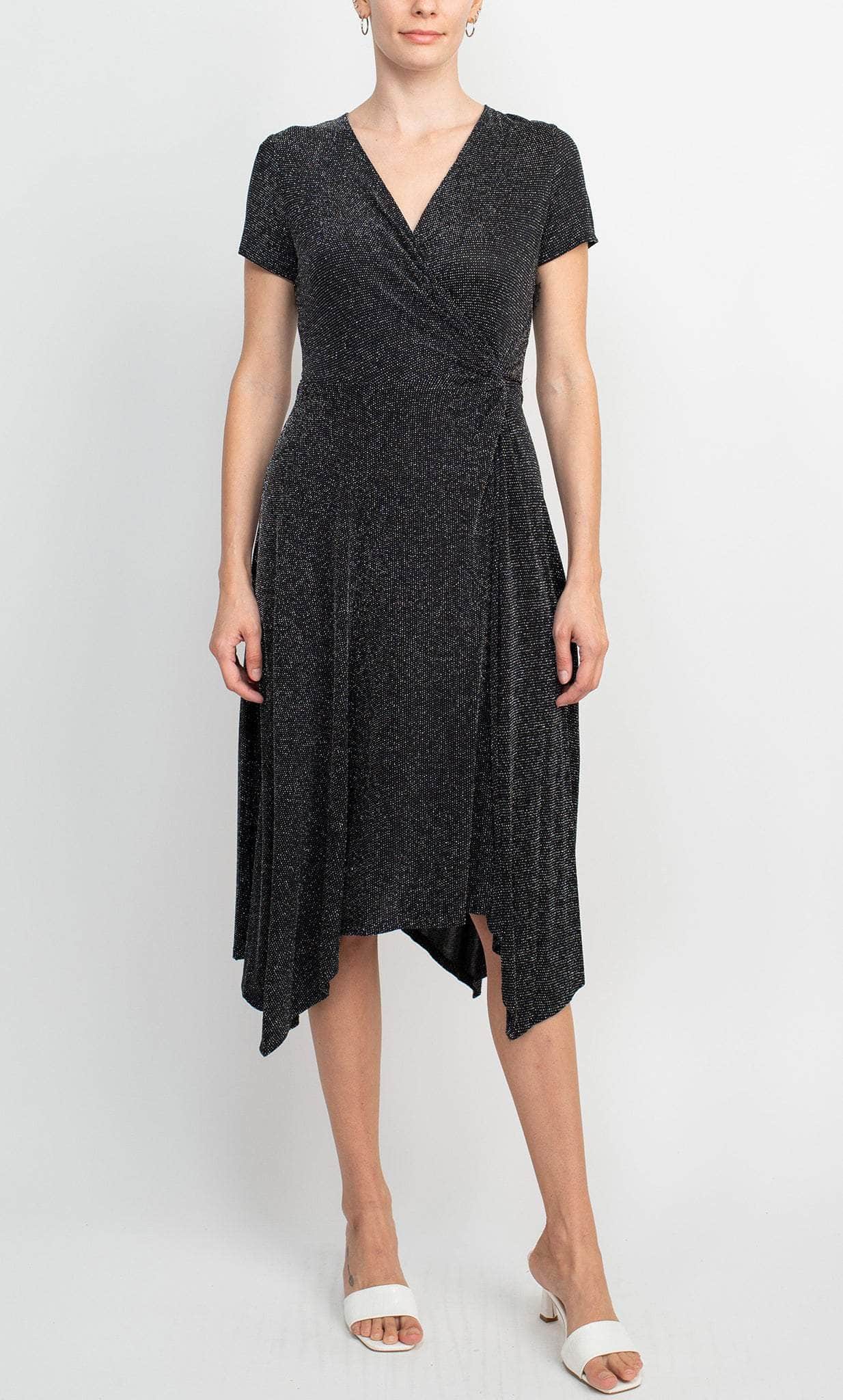 Wear this Scarlett S292150 to stand out in any crowd. Be the lady of the night in this amazingly fabulous dress, which has a faux-wrapped bodice crowned with a V-neckline and short sleeves. A knotted tie at the side accentuates the bodice. The A-line skirt is knee-length and has delicate pleating. This dress is sure to turn heads. This Scarlett S292150 is sure to be an attention-grabber in any occasion. Model is wearing Black Silver color.