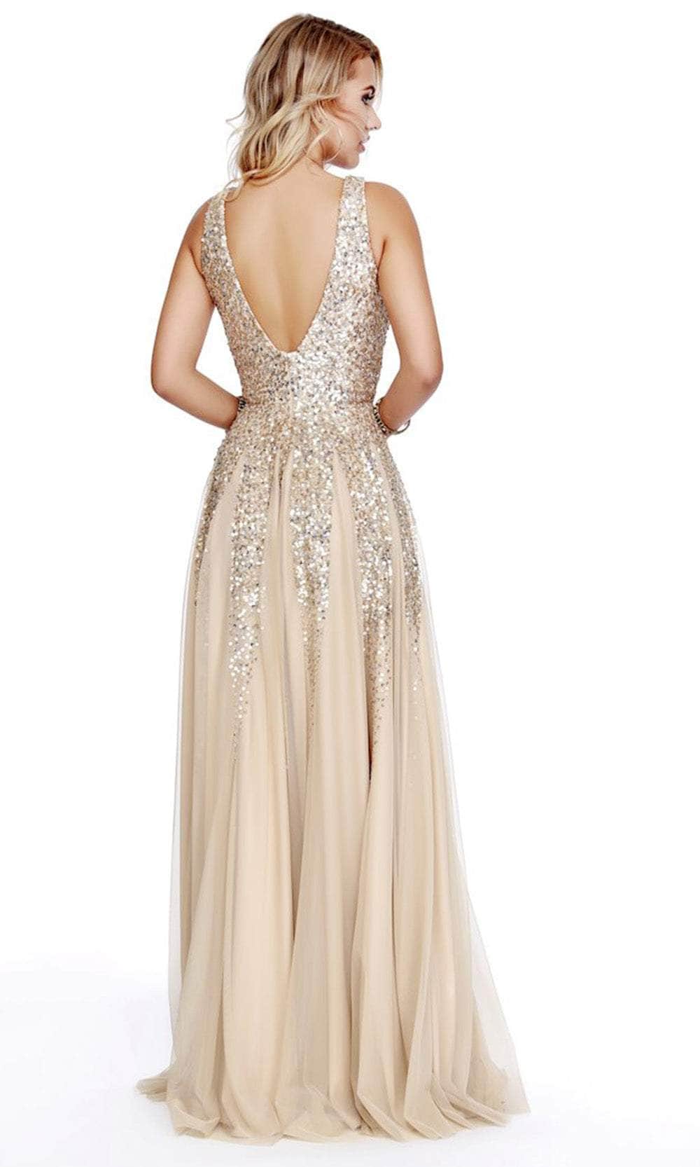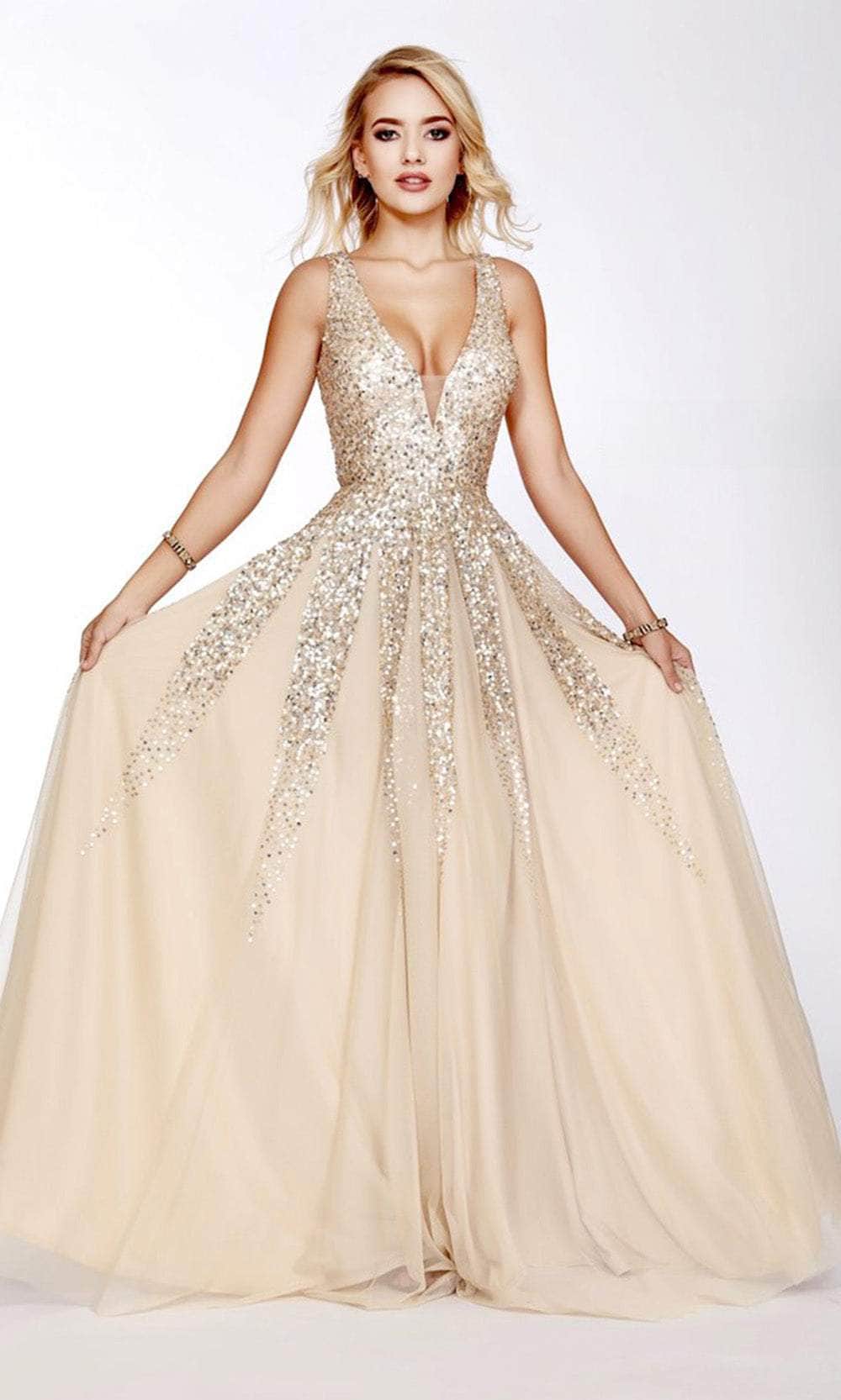 Shine beneath the party lights in Diva in Shail K 12207 evening gown. Exquisitely adorned with a monochromatic array of sequins on tulle fabric, this glamorous sleeveless ensemble enhances the charm with a deep V neckline featuring a mesh inset and a flattering V-shaped back. The fully embellished fitted bodice is designed at the natural waist, with sequins forming elegant columns that cascade like icicles into the delicate layers of the flowing A-line skirt. The gown concludes with a floor-length hem with a zipper closure at the back. Capture the brilliance of an evening superstar in this romantic masterpiece from Shail K 12207.