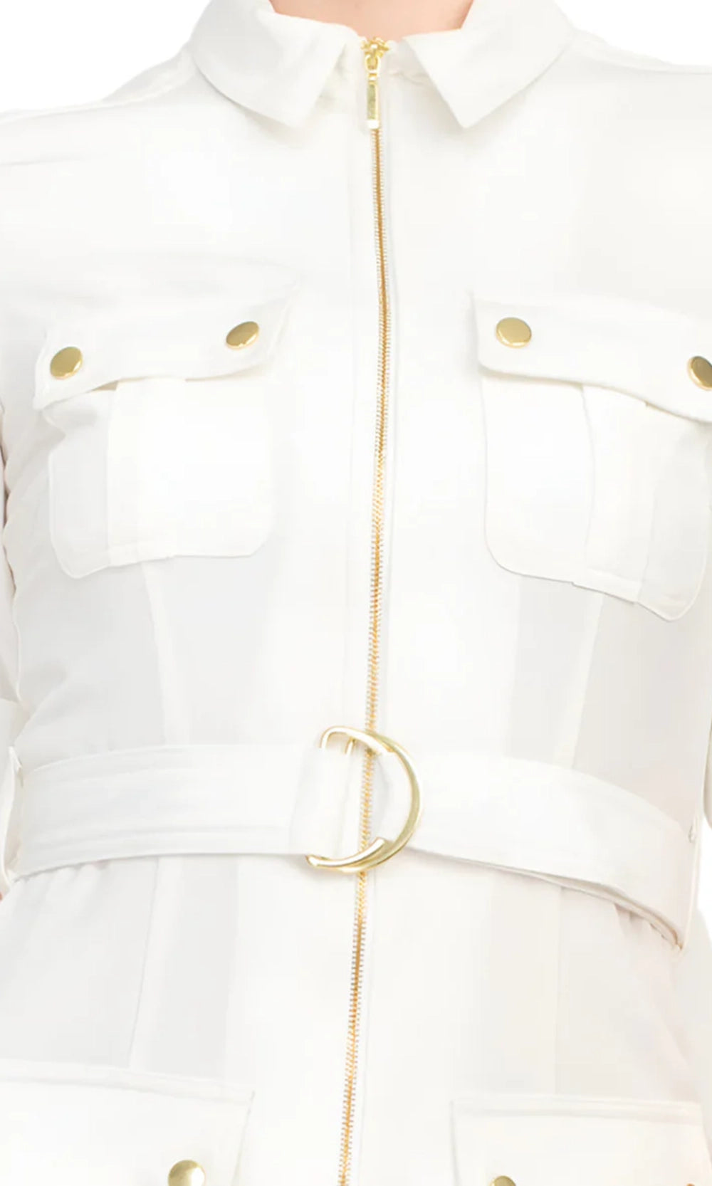 | Details: | Gold Zipper Front, Short Sleeves, Self-Tie Belt, Front Pockets, Closed Back |