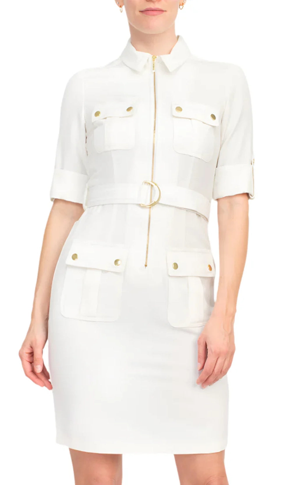 Redefine utility fashion with the Sharagano HW3S19635, a piece that merges practicality with refined modern flair. Featuring a front gold zip closure, this sheath design is finished with front pockets, short sleeves, and a matching self-tie belt that cinches the waist. The structured fit and rayon fabric deliver tailored comfort, while the button detailing adds subtle texture. Designed for versatility, this Sharagano HW3S19635 sheath dress transitions seamlessly from office meetings to casual evenings. Models are wearing Ivory, Toasty Sand, Red Riding Hood, and Very Black colors.