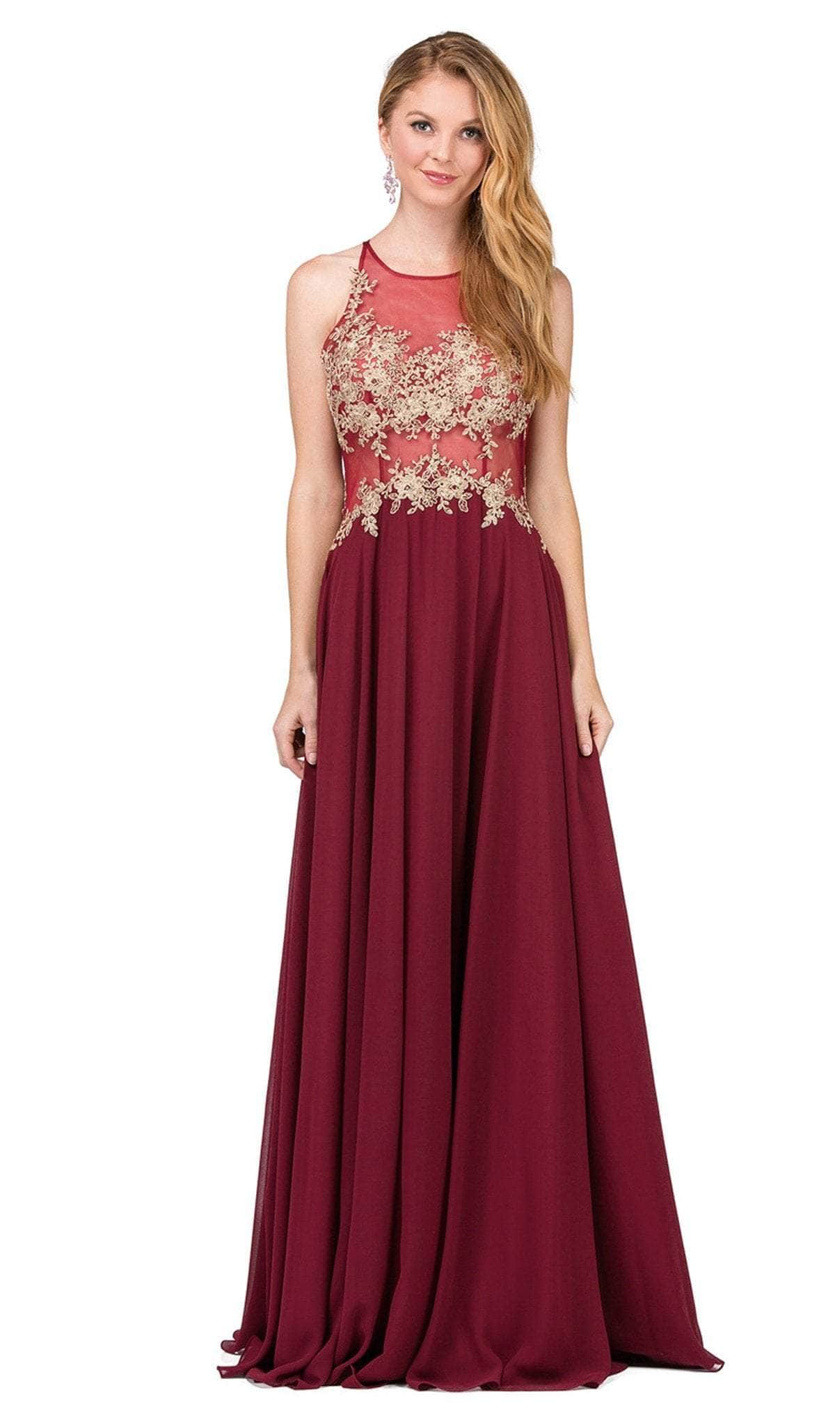 You will achieve class and sophistication when you show up to your event in this dreamy long dress by Dancing Queen - 2297. Intricately adorned with embroideries, this sleeveless dress features an illusion halter neckline on a sheer fitted bodice. It impresses with a sheer racer back with a zipper closure for a perfect fit. Starting from its natural waistline, the flowy skirt flourishes to an A-line silhouette as it cascades to a floor length hemline. Bloom with beauty and love as you saunter towards forever in this masterpiece by Dancing Queen - 2297. Models are wearing Blush, Burgundy and Navy colors.