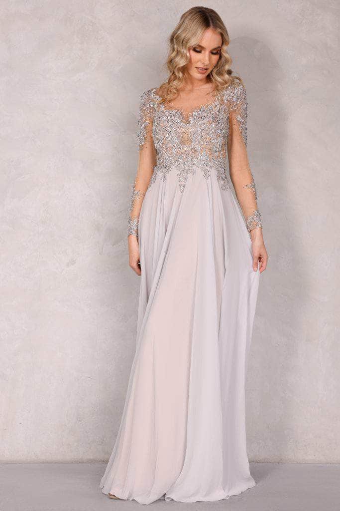 This long gown is constructed of luxurious Chiffon and beautifully embellished with a sheer long sleeve divinely adorned with special jewels of beads. The scoop neckline and embroidered applique bodice work together to give this dress a charming and sophisticated look. The sheath silhouette flows over the hips and flutters down into a modest train. Model is wearing the Light Silver color.