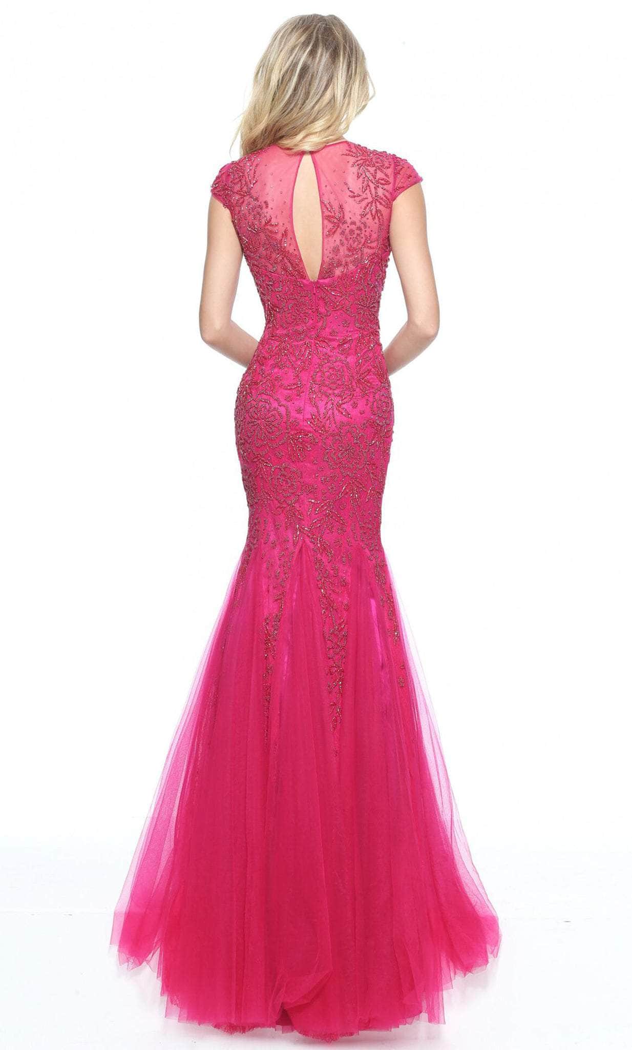 Shine with lavish elegance on the red carpet in this Sherri Hill 51117 creation. Skimming with a curvy fit around the bust and hips, this ensemble shows a sheer jewel neckline with cap sleeves. Embellished with crystalline floral beadwork along its length, a sheer cutout back adds interest to this gown. Gossamer godets stream down the full-length mermaid skirt as it touches the floor. Make everyone turn their heads in this Sherri Hill masterpiece. Model is wearing the Berry color.