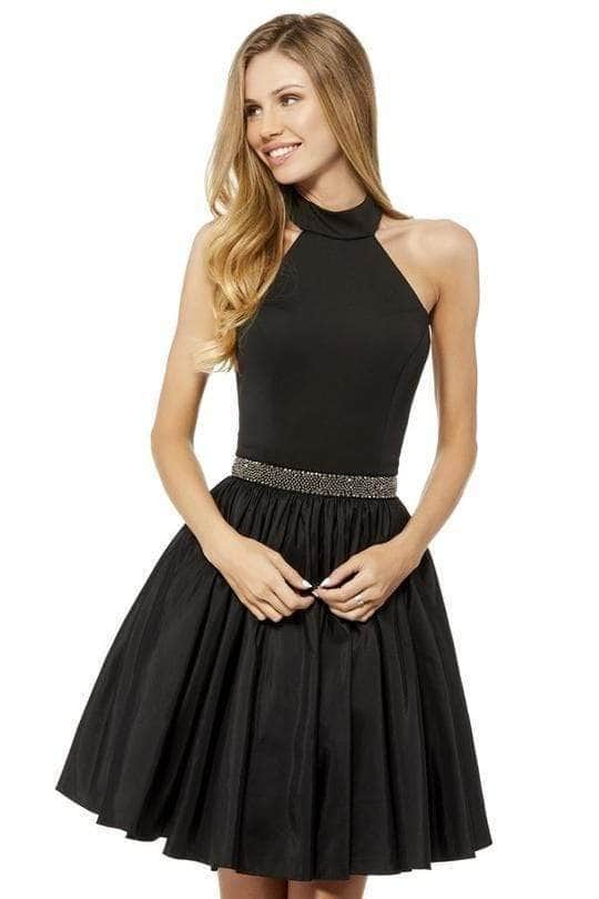 A high halter neckline crowns the princess seamed bodice complemented with a mid-open zipped up back. The short, a line skirt is tailored in taffeta and has a glittering beaded waistband. Model is wearing Black color.
