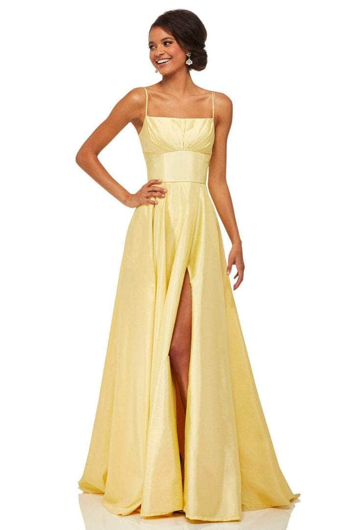 Stunningly sculpted with seams on a lustrous Taffeta, this fabulous piece presents a sleeveless, straight across neckline framed with spaghetti shoulder straps. Delicately detailed with pleats on the bust, this ensemble is sleekly flattering with its nipped bodice. Showcasing a spectacle of those legs with a high slit, the A-line skirt flares with fine sheering that fall down to a full-length hemline. Model is wearing Yellow color.