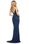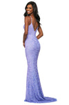 Saunter into the ballroom and charm everyone in this alluring Sherri Hill 53449 creation. Textured with shimmering sequins allover its length, this gown features a deep v-neckline hanging from spaghetti straps. Nipped with a tassel tie belt and plunged with a v-style at the back, the trumpet skirt opens with a high slit as it cascades into a sweep of train. Leave a trail of besotted admirers in this exquisite Sherri Hill masterpiece. Models are wearing the Gold, Navy and Periwinkle colors.