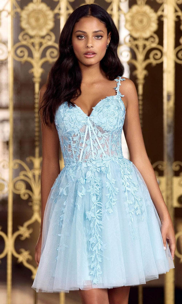 Embrace a radiantly romantic look in the flatteringly feminine dress from Sherri Hill 55107 creation. This garment will make you look lovely thanks to its corset top with leaf-lace accents and spaghetti straps. The short length of the hem of this A-line skirt is complemented by the embroidery of leaf motifs and the exposed zipper in the back. Clothe yourself in creative couture with this dazzlingly mellifluous cocktail dress from Sherri Hill 55107 creation. The model is wearing a Light Blue color.