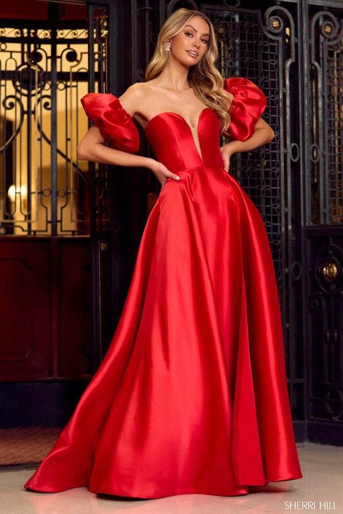 Be in this gorgeous Sherri Hill 55253 creation and leave a lasting impression. This eye-catching strapless Mikado fabric dress with an A-line silhouette and a deep v-neckline will highlight your features and bring a stunning look. Imagine a flattering silhouette from the fitted bodice sculpted in clean seams down the floor-length A-line skirt with that elegant slit. Because this gown has a full back zipper closure, you can move freely. In this timeless Sherri Hill masterpiece, you'll exude class and poise as you dance all night. Model is wearing Red color.