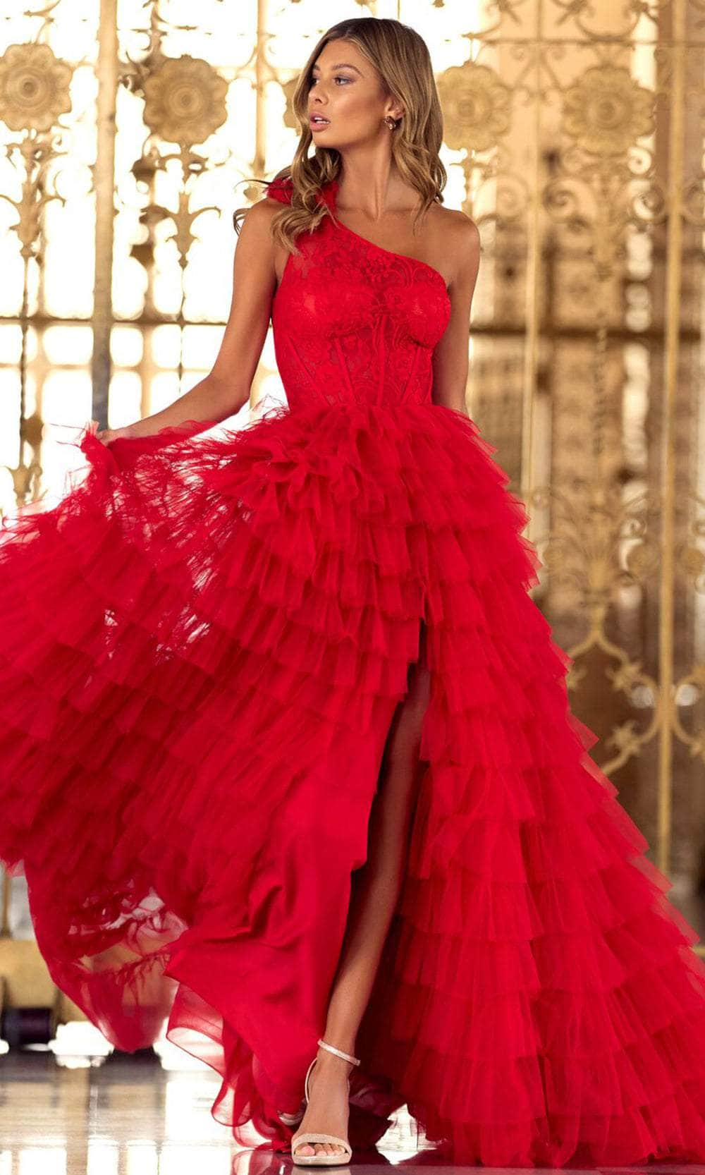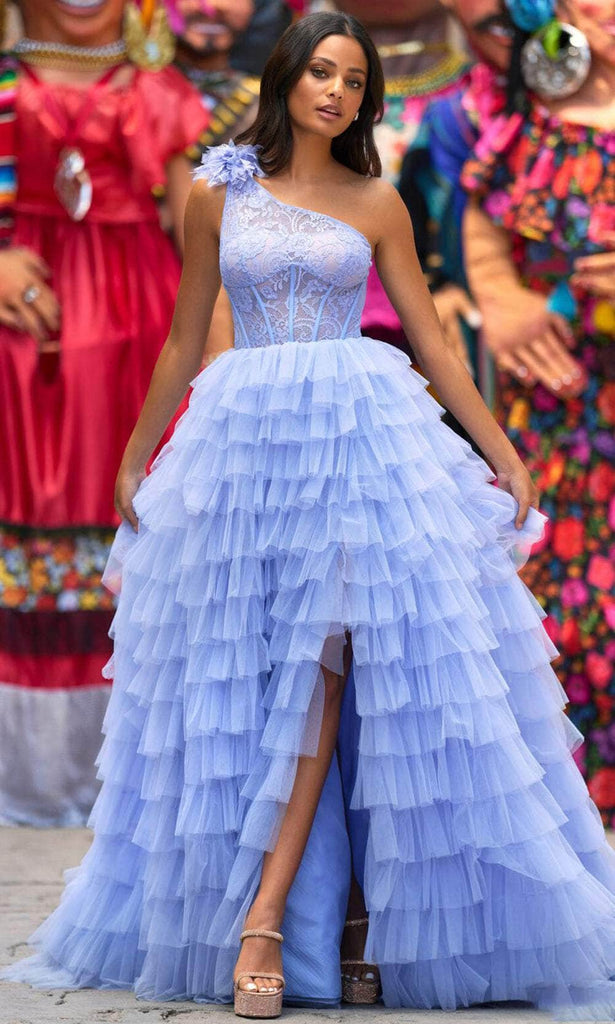 Steal the show in this dazzling look Sherri Hill 55256 dress. The asymmetrical neckline of this glamorous gown stands out. The corset bodice is embellished with lovely Steal the show in this dazzling look Sherri Hill 55256 dress. The asymmetrical neckline of this glamorous gown stands out. The corset bodice is embellished with lovely appliques and it has a 3D floral detail topped in the one-shoulder sleeve. The slit accentuates the ruffled A-line skirt that falls gorgeously into a full-length hemline and is finished with a court train. Orchestrate your moment to stand out in this Sherri Hill 55256 masterpiece. Models are wearing Periwinkle and Red color.