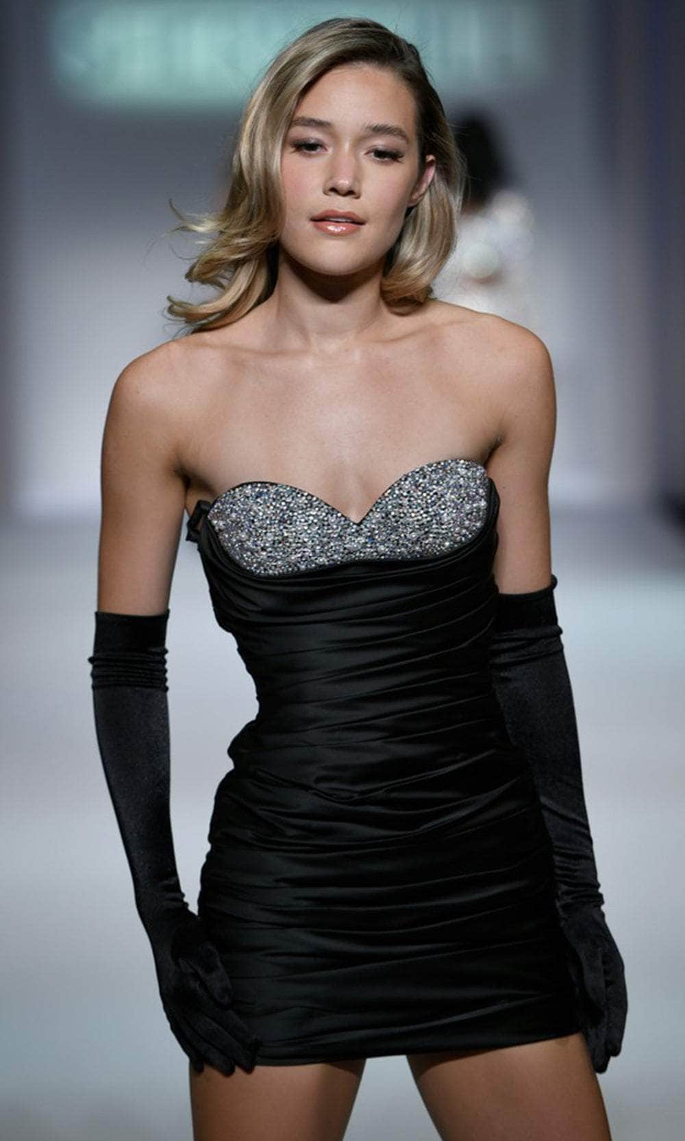 Walk in glamour and let all heads turn on you in this creation by Sherri Hill 55292. This exquisite piece features a sweetheart neckline that is decorated with pearls and a strapless construction with a pleated fabric that begins below the neckline and continues throughout the entire bodice. Additionally, this item is constructed without any straps at all. Radiate a fresh style as you orchestrate a dramatic entrance in this radiant Sherri Hill creation. Model is wearing Black color.