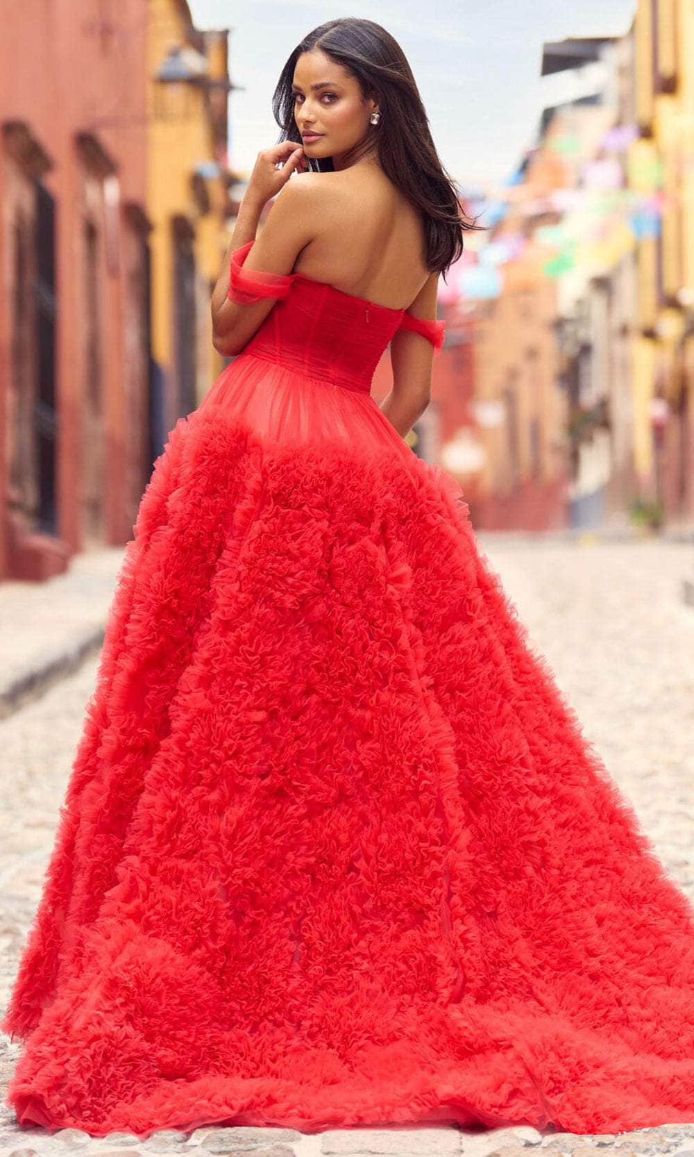 Charm everyone with your very presence in this absolutely stunning gown by Sherri Hill 55324. This style beautifully features a ruched sheer bodice with boning detail, a straight-across neckline and draped off-shoulder sleeves. The ballgown skirt is designed with ruffles of tulle and has a thigh-high slit before cascading to the full length hem and chapel train. A center zipper closure is used at the mid-open back to keep the outfit in place. Feel dainty and feminine in this enchantingly designed Sherri Hill 55324 creation. Model is wearing the Red color.