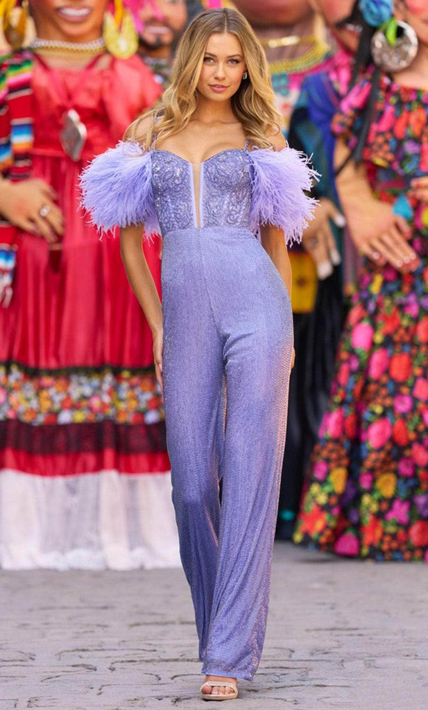 Get ready to fascinate the crowd in this Sherri Hill 55352 creation. An off-the-shoulder neckline, a corset bodice accented with a sheer insert, and an open back with a lace-up tie for a perfect fit bring an elegant touch to this gorgeous piece. It also features beaded embroidery. The full-length pants have a flared hem and a zippered clasp at the back. Wear this stunning jumpsuit by Sherri Hill 55352 to make a grand entrance that everyone will remember. Model is wearing Periwinkle color.